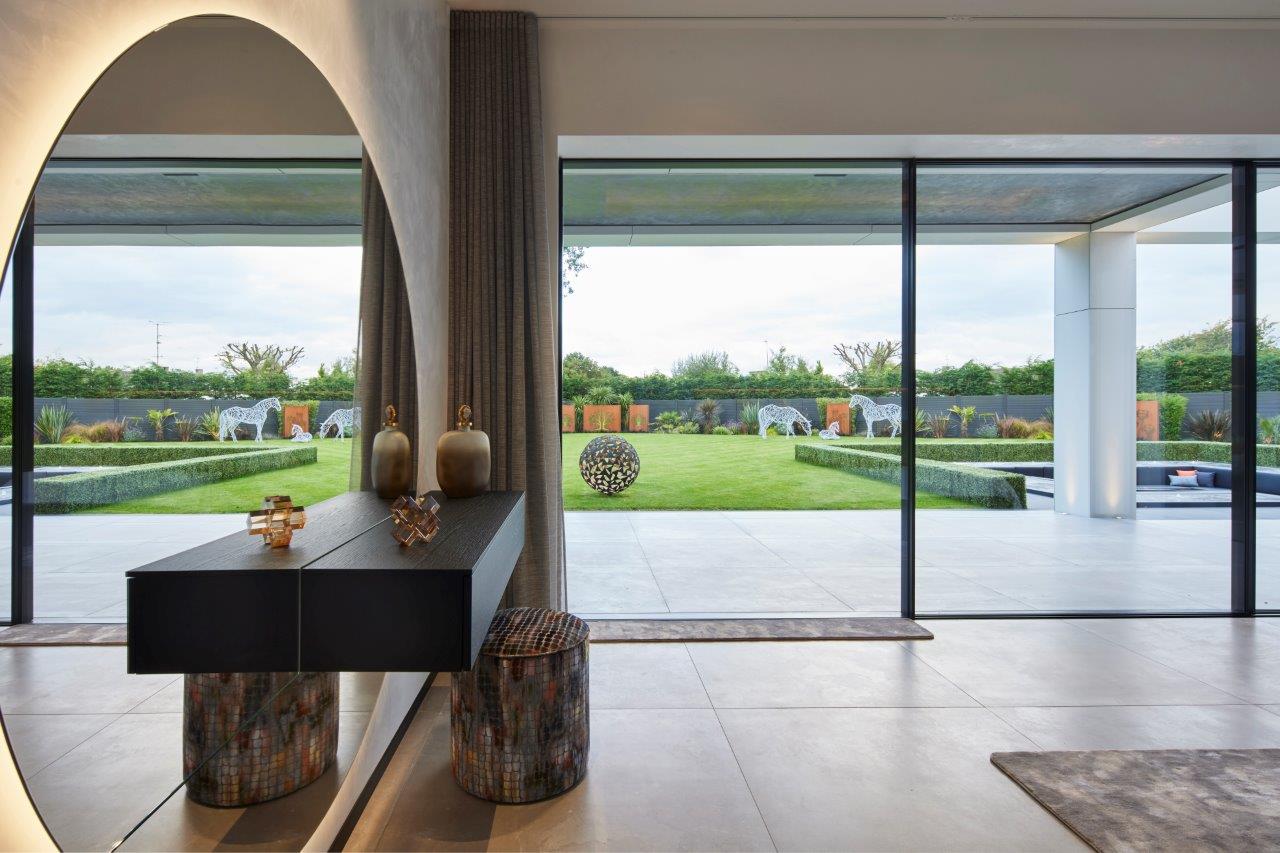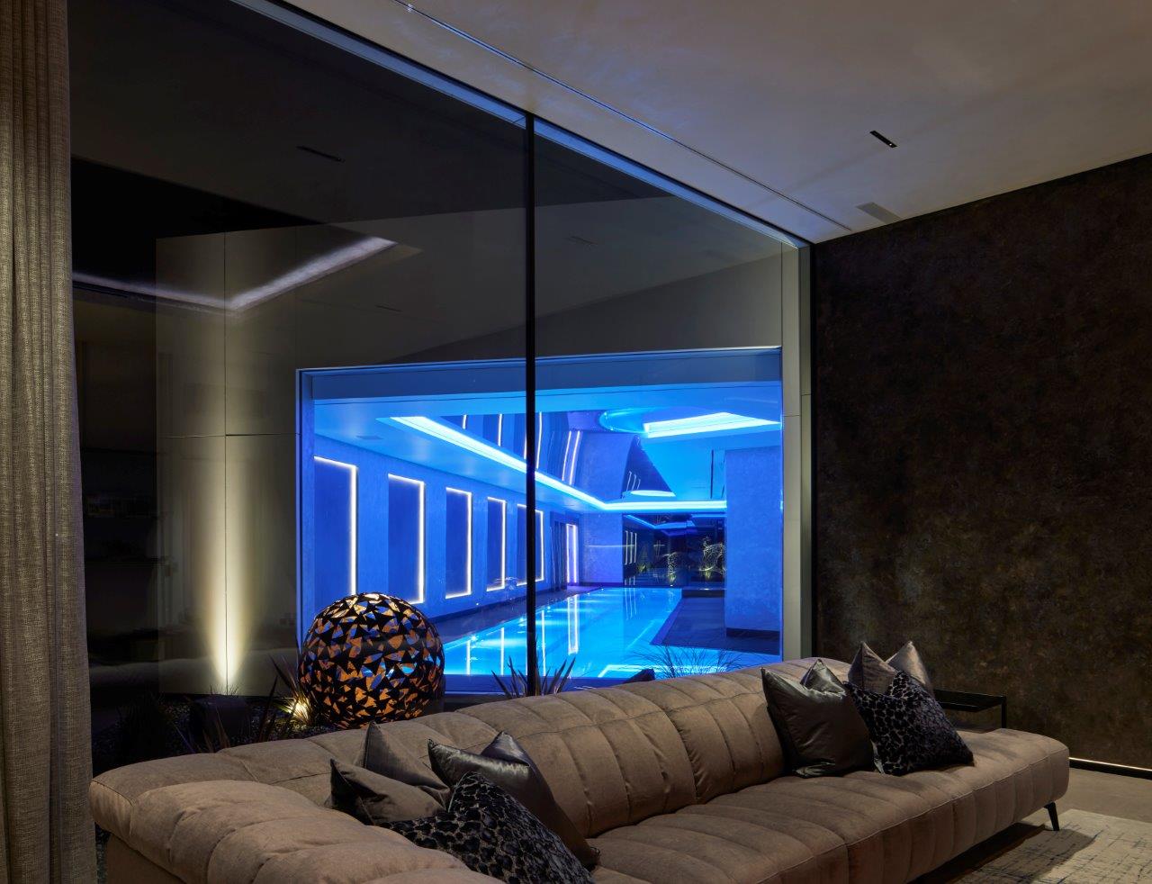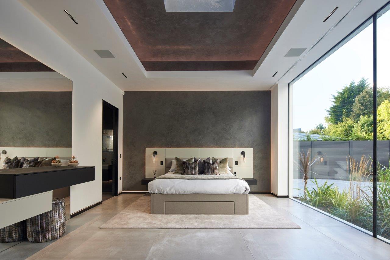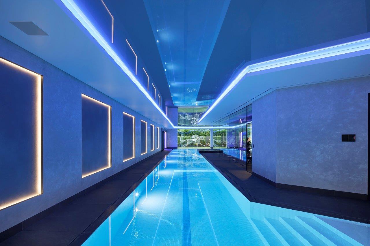 Built in the 1950s, this striking 13,000ft² contemporary home offers a stunning, living space inside and out, including an Olympic-length swimming pool, a high-end gym, nine bathrooms and open plan communal spaces that adapt to the client’s needs at the touch of a button.