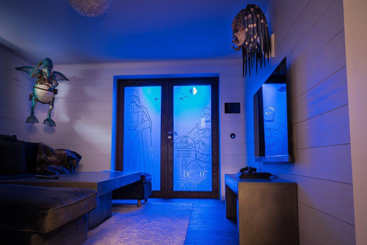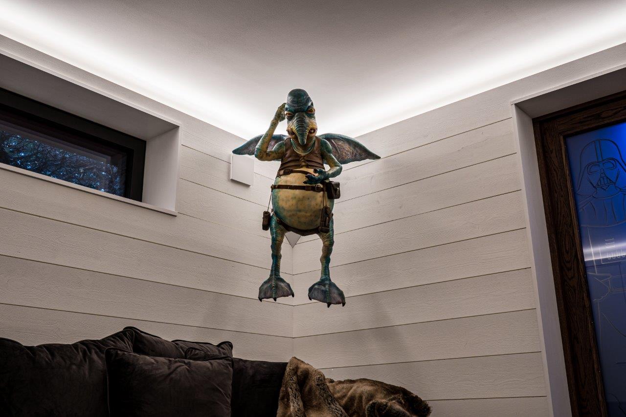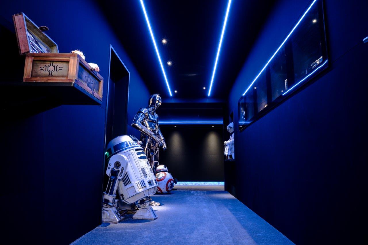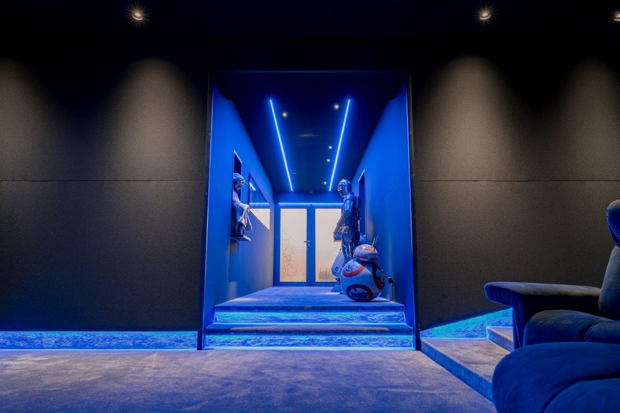 Benoit observes, “Encountering a life-size C3PO and his R2D2 friend upon walking into the cinema tells you immediately that you are not in your usual home cinema! We were highly impressed by all the original Star Wars memorabilia. Then, entering the cinema itself, the volume of the room was the first big impression, followed by the sense of comfort and performance that comes from the selected fabrics and overall design. Everything is hidden and nicely lit as expected, but even before seeing or hearing anything, one senses that this cinema was conceived by experts to reach for the ultimate experience.