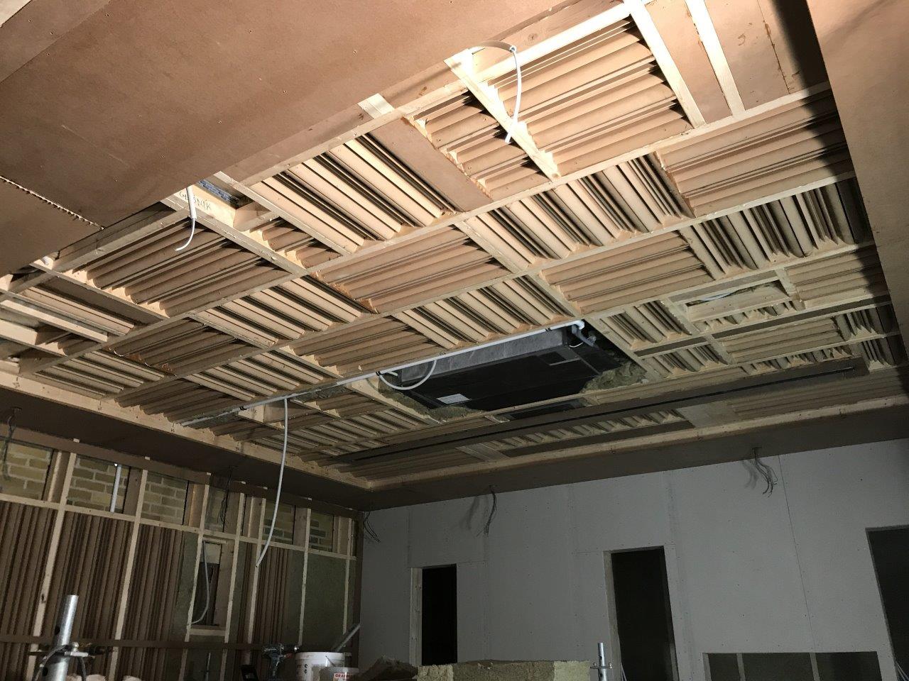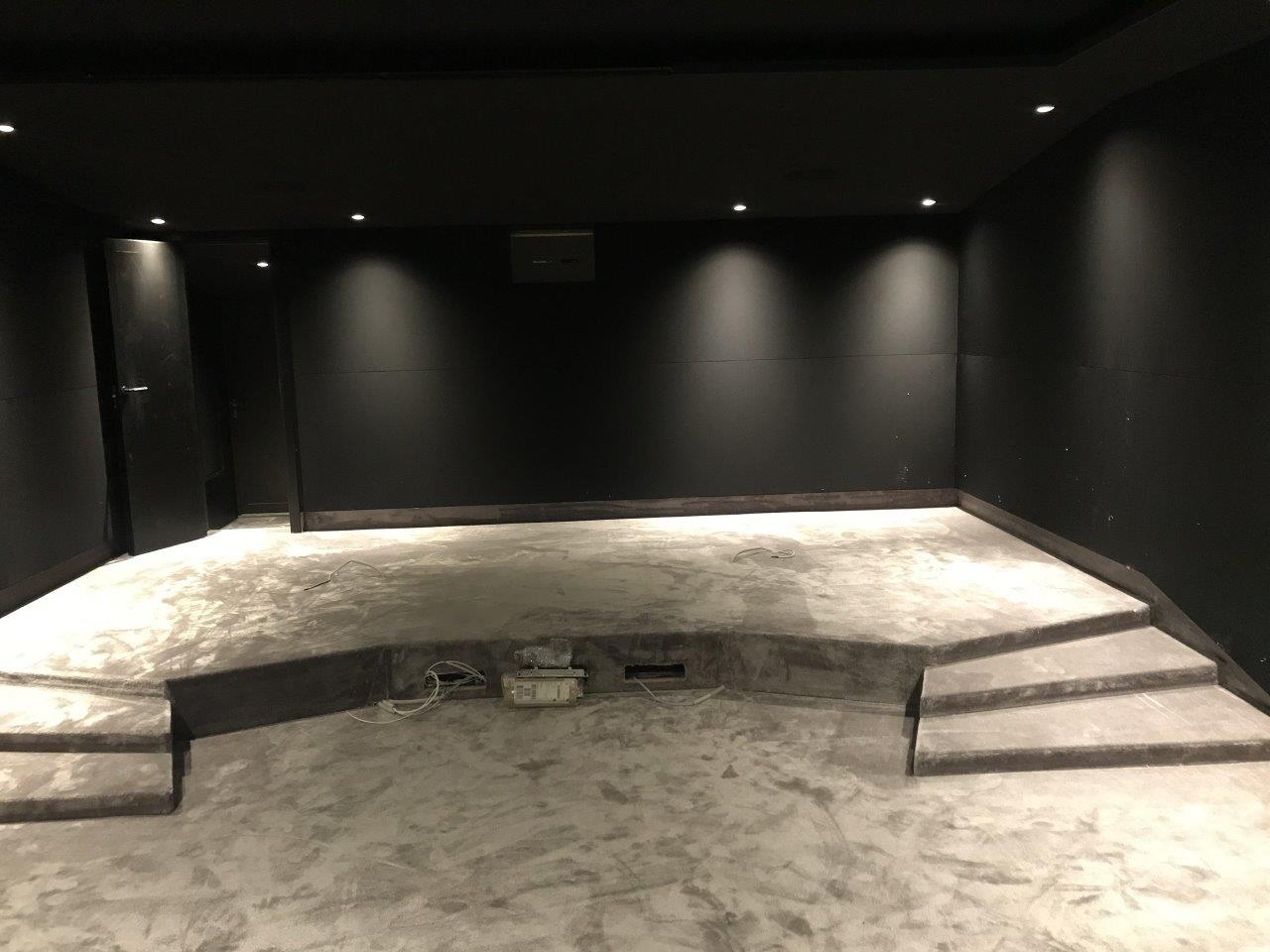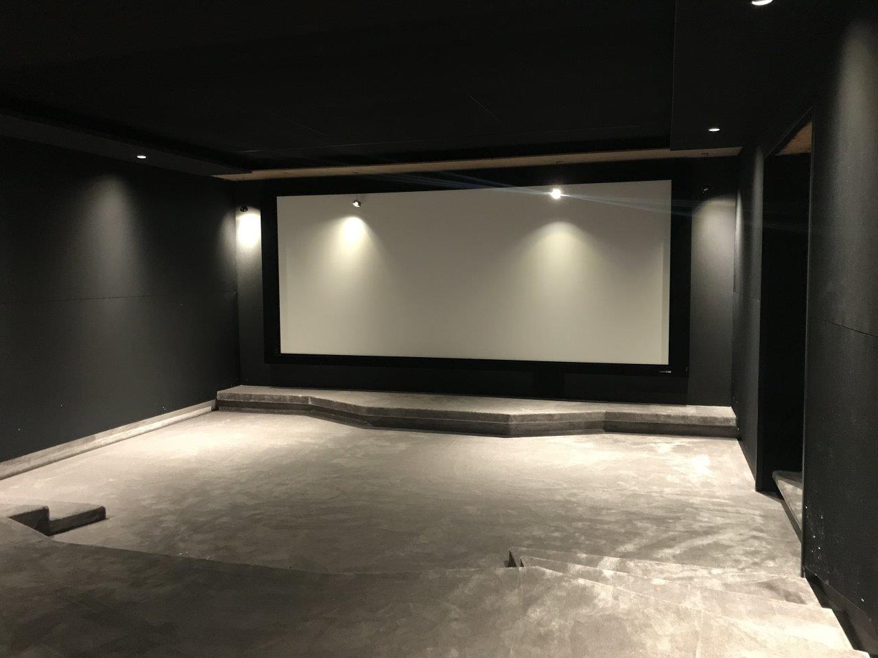 The space itself measures 6 x 12 metres (70 metres square approx.), however, after the concealed custom acoustical treatments were added, the cinema proper measures 6 x 8.5 metres. The equipment room is located to the rear of the cinema in a separate space.