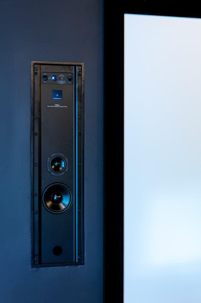 The room features a 5.1 audio solution, which includes three Meridian DSP520 in-wall loudspeakers for the LCR channels. The DSP520 in-wall loudspeakers inherits the latest technologies from Meridian’s