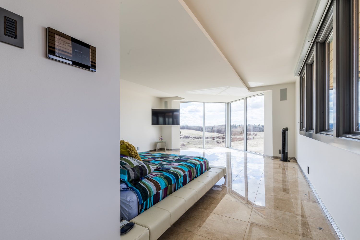 Home Concepts also installed two ELAN S86A Integrated Multi-Room Audio/Video Controllers in the East wing, and two ELAN S86A Integrated Multi-Room Audio/Video Controllers in the West wing to distribute audio to 23 zones throughout the house, including to three rooms equipped with surround sound. Sunfire HRS-subwoofers were installed throughout, and carefully concealed in custom cabinets in the living room, kitchen and main home theatre.