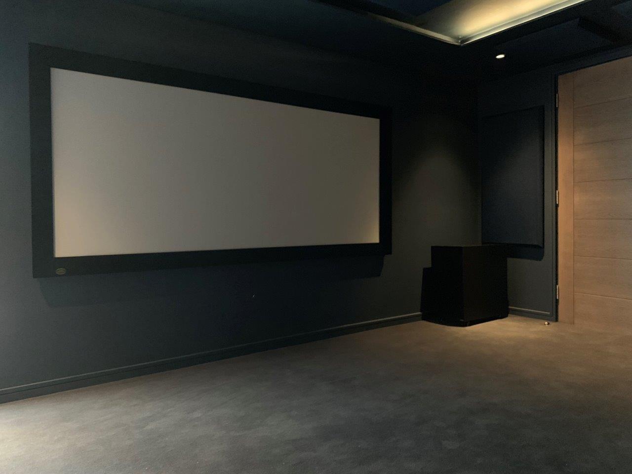 Our design service gave us the tools to turn this room into a very impressive home cinema space for the client and their family to enjoy family time with a movie. The client remit after our demonstrations at our showroom were to have the image as big as possible and the sound to match. We had to go with a custom width screen to achieve the largest image of 91in widescreen in a 2:35 format for that truly cinematic experience.