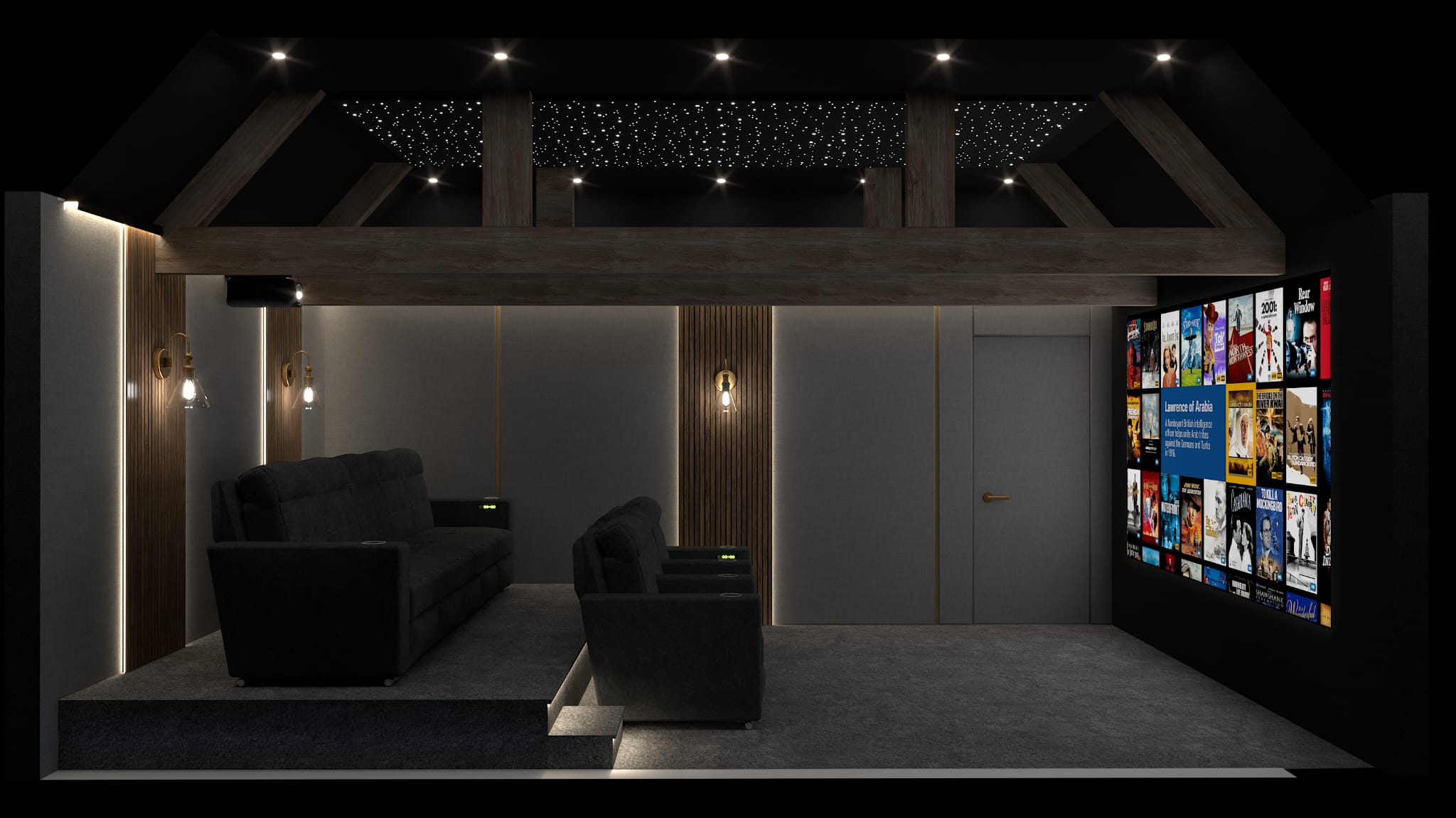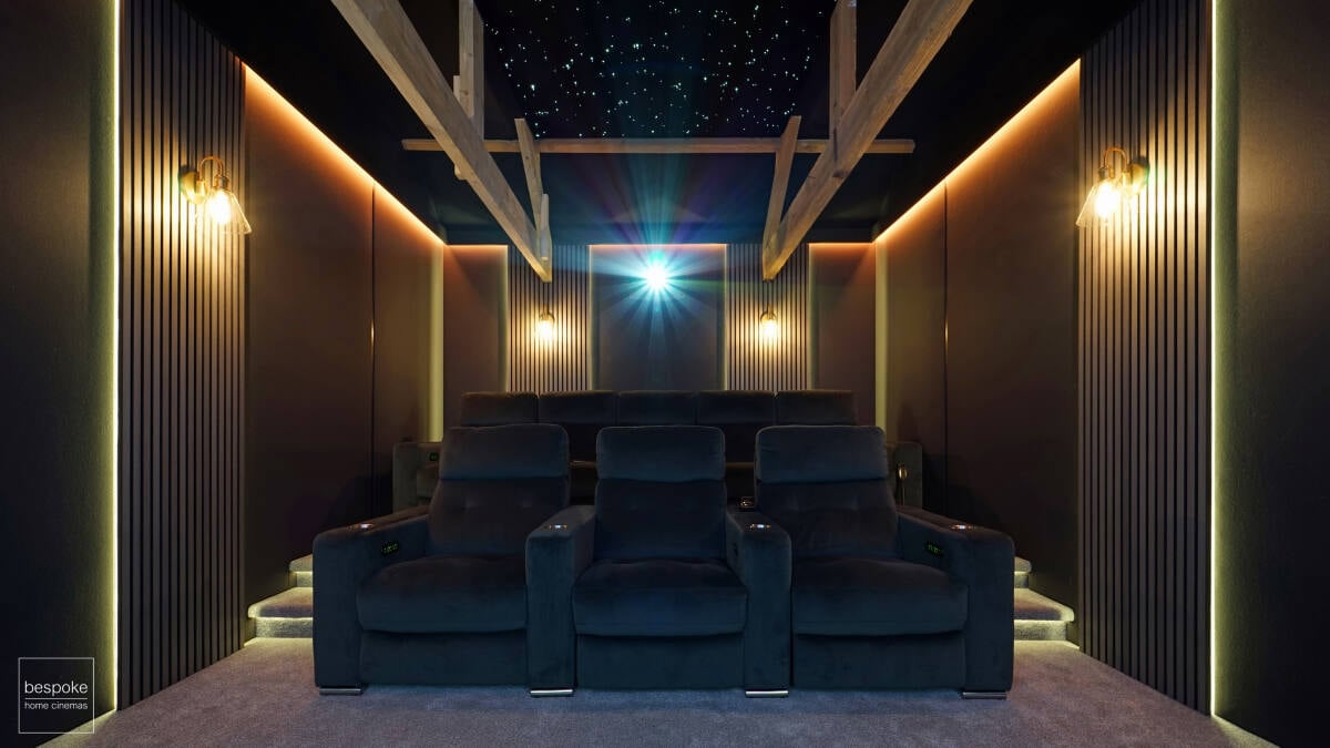 Award-Winning integrator, Bespoke Home Cinemas, were briefed to design and construct a high-end cinema room within this farmhouse property. Capable of offering an aspirational and luxurious, yet comfortable experience for holiday guests, all whilst amplifying the rustic charm of the Falcon Farmhouse. The space should not only add value to the property but also elevate the overall guest experience, setting a new standard for luxury farmhouse retreats.
