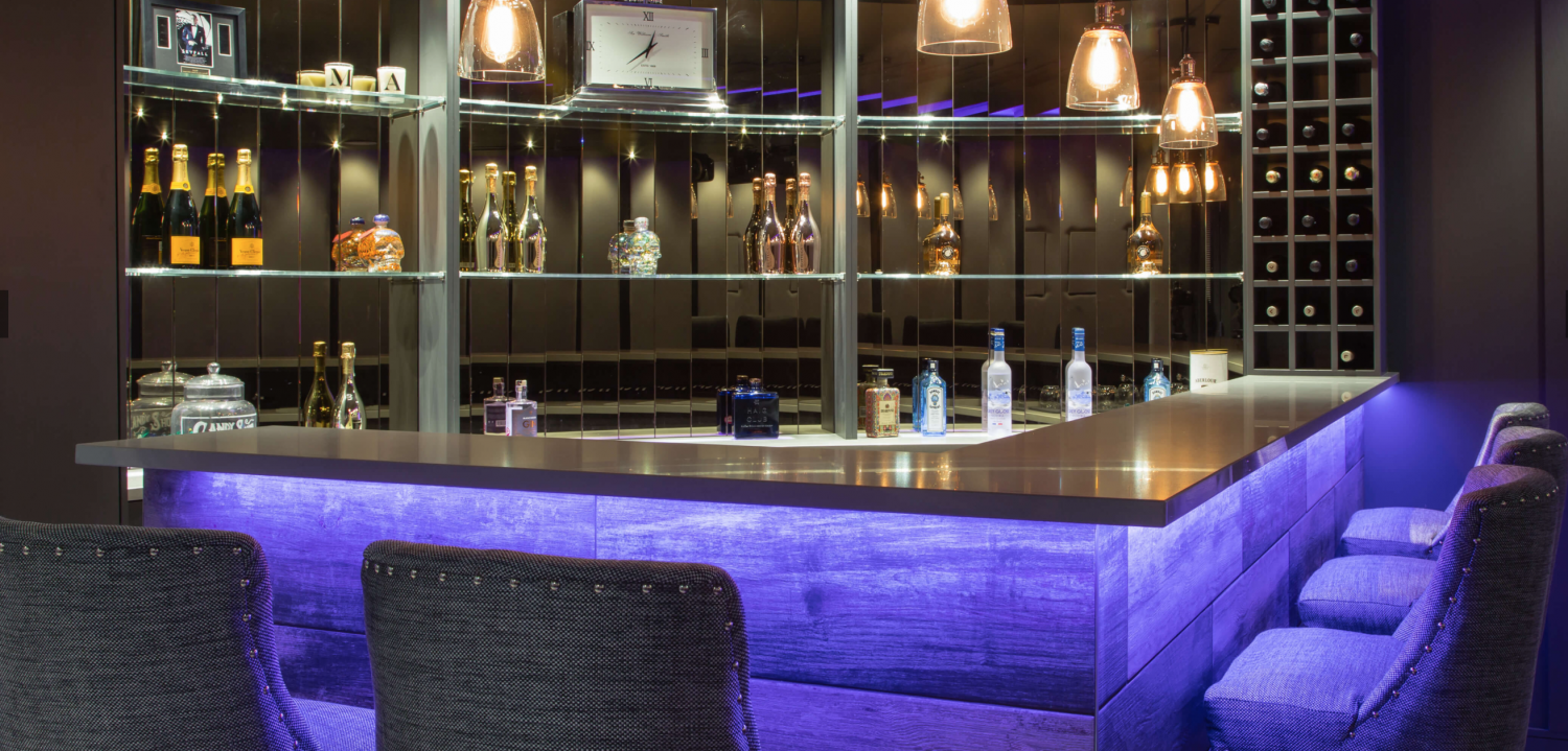 The room build design was completed by Finite Solutions to allow the client’s existing contractors to build the new stud work walls, run new audio visual and lighting cables and construct the bespoke bar.