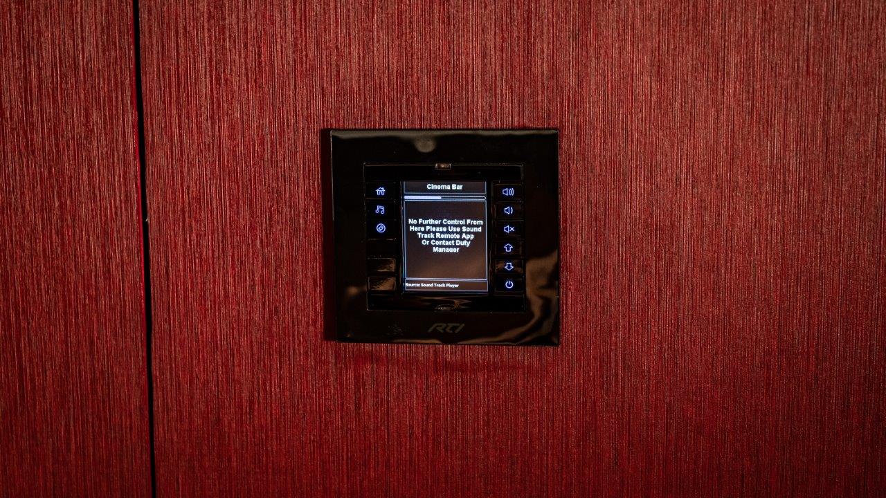 Control: RTI; XP Series Control Processor, XP Series Control Expansion Module, 11in In-Wall Touch Panel (Cinema Room), 11in In-Wall Touch Panel Backbox, KX2 Colour Touch Panel (Projection Room) and KX2 In-Wall Touch Panel Backbox