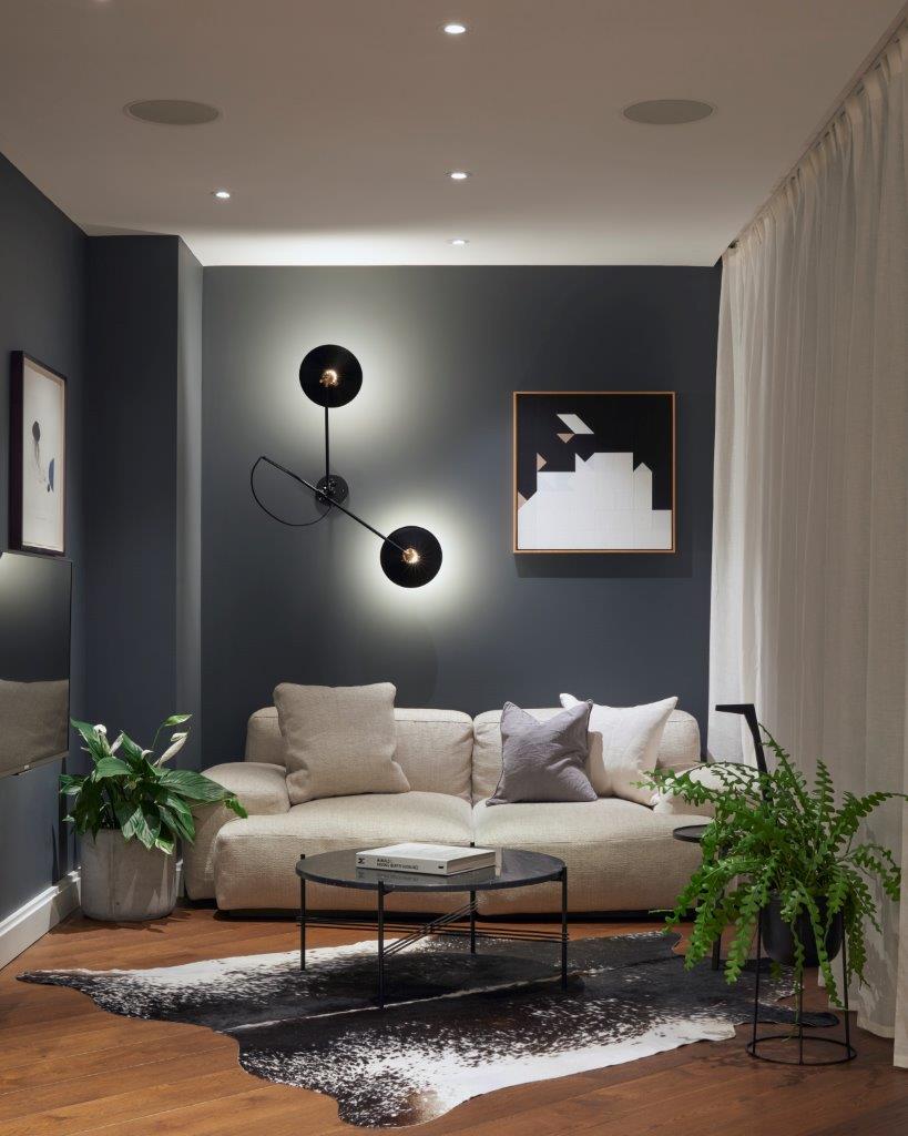 The main display for the dwelling is a 85 inch Sony 4K HDR TV (KD85XD8505BU). As competitive online gaming is something the owners enjoy, the TV was chosen for its low input latency and high quality 4K HRD image. It’s slim profile complemented the minimal design of the flat also.