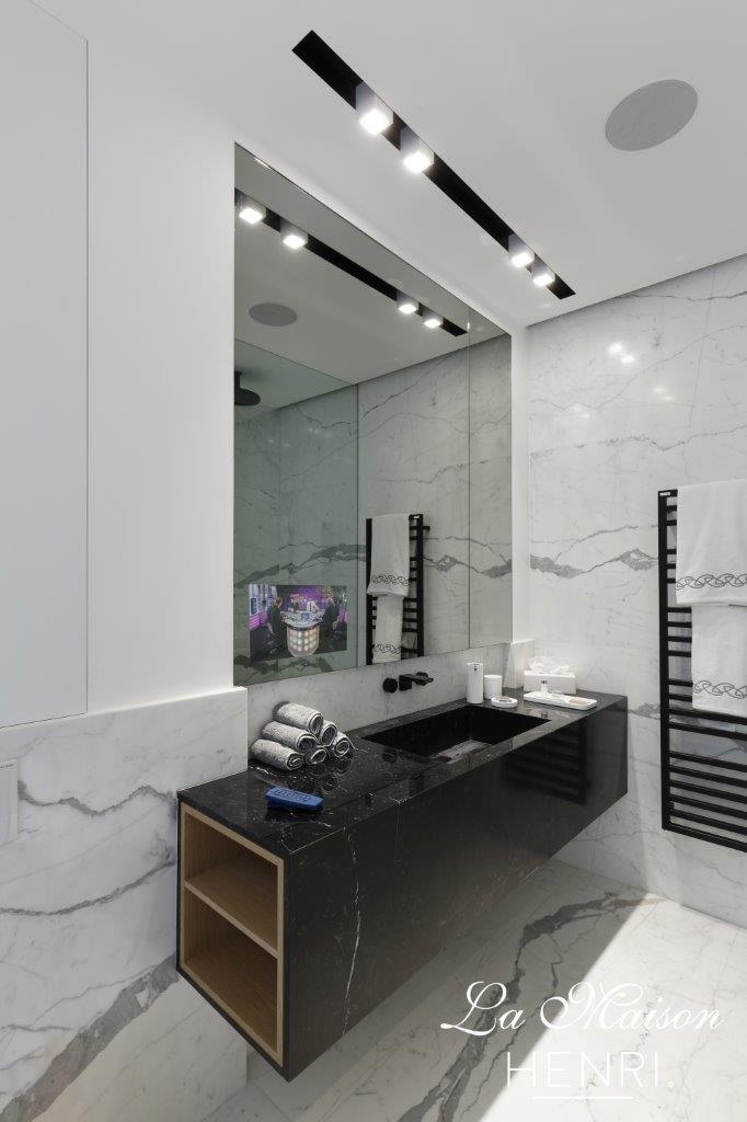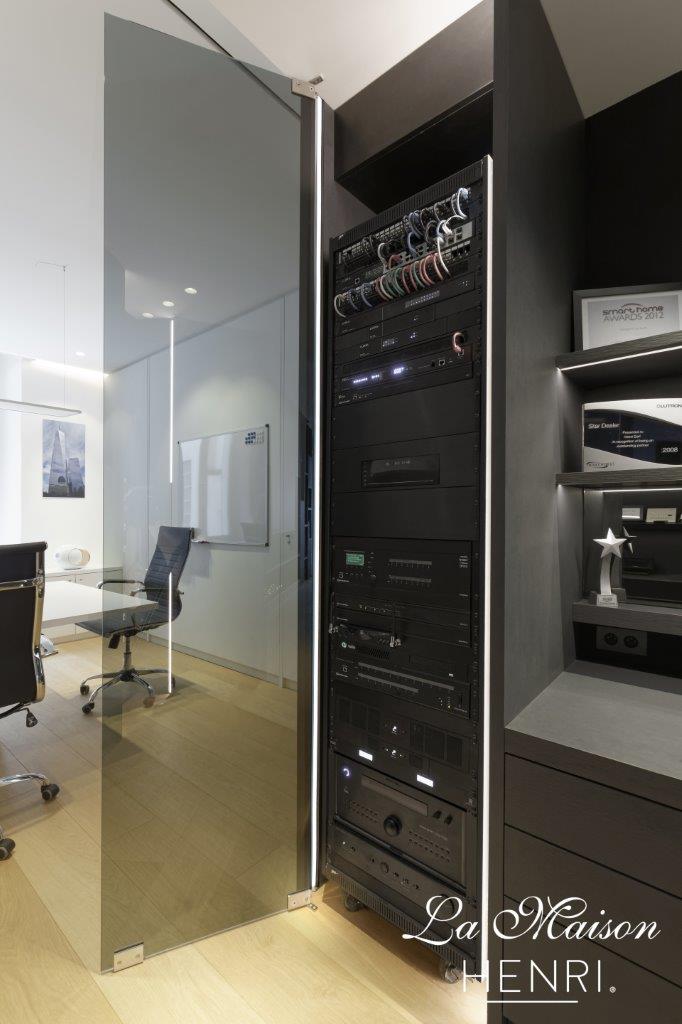 Henri wanted to demonstrate the benefits and easiness of use of an integrated home. For that reason, the integrator focussed on the user interfaces. The apartment’s chosen control system is Crestron; the controls include two Crestron TSW-752 touchscreens, a Crestron TSR-302 and a Crestron MLX-3 handheld remotes, iPads, and a waterproof Crestron WPR-48 controller in the bathroom. The showroom also boasts Lutron controls, with a range of keypads to control the lighting, and Lutron Siovia controls to operates the automated blinds throughout the home.