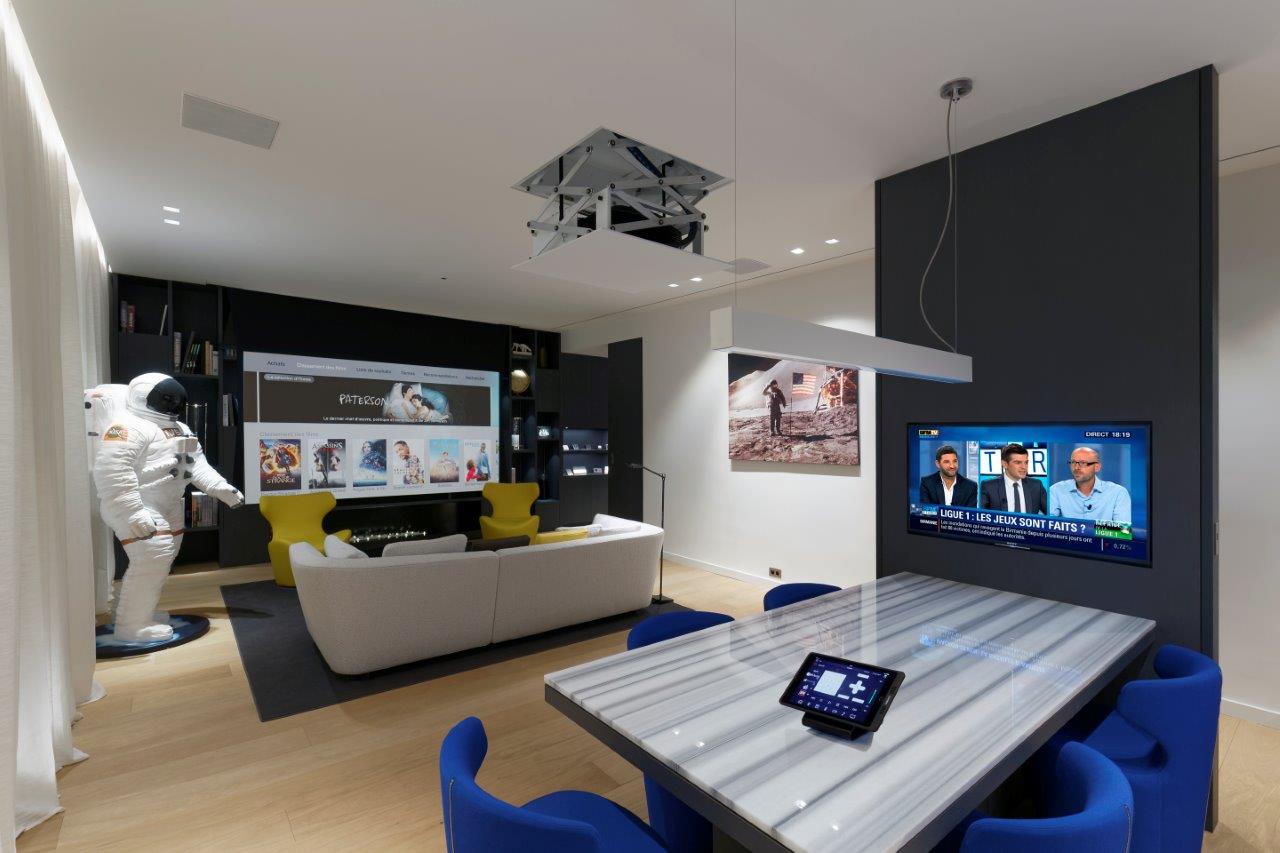 The fully functional apartment – named La Maison – consists of a living room, kitchen, bedroom, bathroom and office space, and features lighting and blind control, security, network, HVAC, and an AV system that includes in-celling, invisible, flush-mounted, bookshelf and waterproof speakers, multiple televisions, a projector, and a mirror TV in the bathroom.