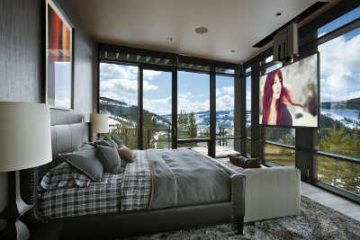 The interior floors seem to flow outside into a natural stone that mimics the interior porcelain almost exactly. The home’s architectural stacked stone and stucco surfaces creates a simple aesthetic inside and outside the home, allowing the windows and doors to take center stage.