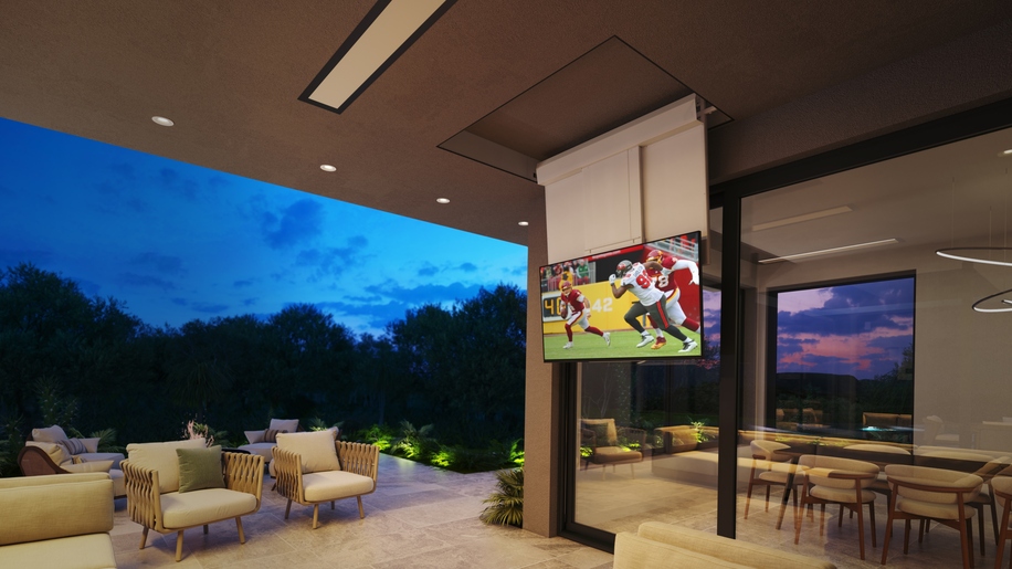 “TVs are an important part of the homeowners’ lifestyle, and incorporating TVs on the exterior can be problematic,” says Ted. “However, the Nexus 21 lift was the perfect solution.”