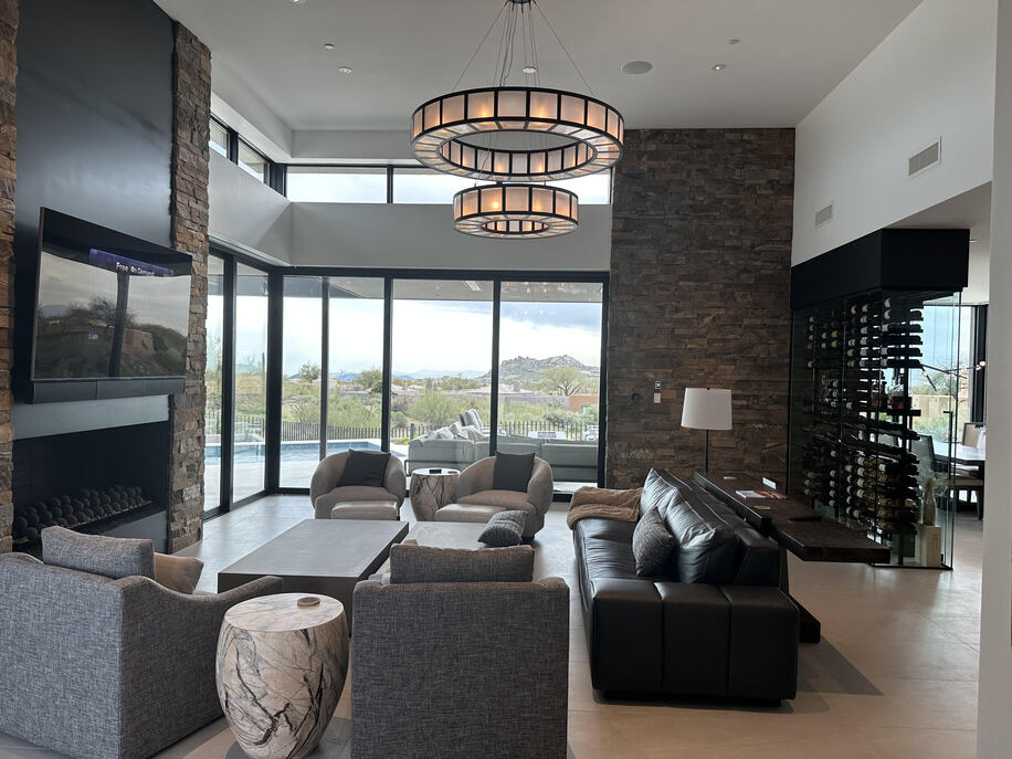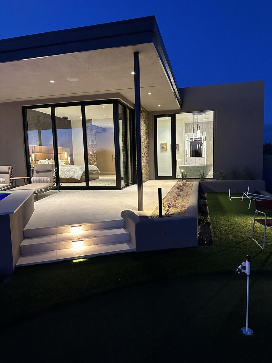 For a complete living area that feels just as comfortable as the inside space, designer Kristin Hazen of Kristin Hazen Design established multiple seating areas adjacent to an elegant pool. These include a simple dining area, a larger lounge space and more intimate seating around a fire element. Each of these are illuminated thoughtfully at night, allow views of the sunset, and enjoy some shade during the hot daytime hours.