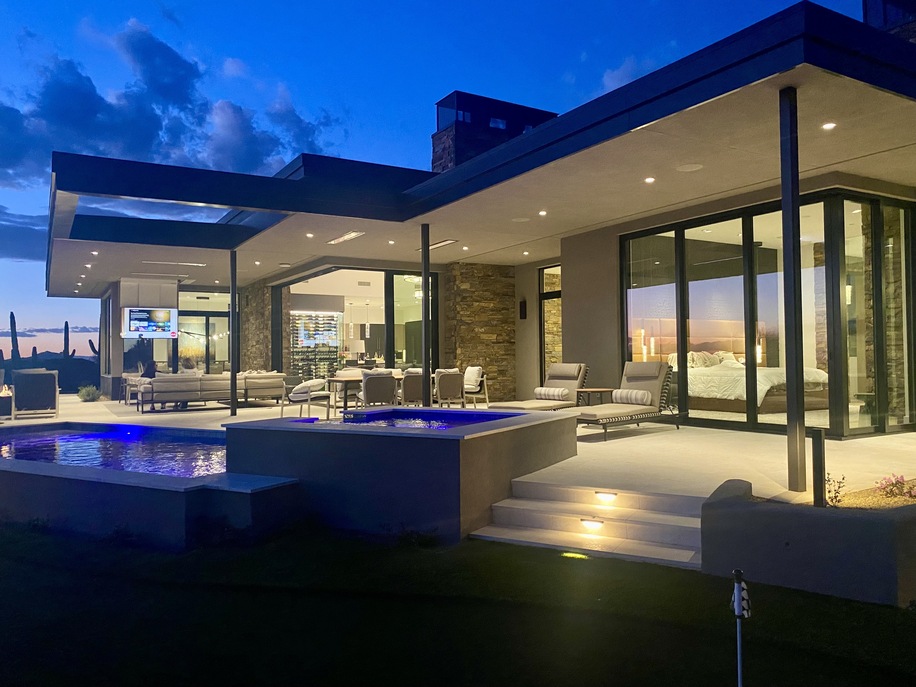 The dry Arizona climate is ideal for outside living. With low humidity and minimal insects, homeowners can enjoy their outdoor areas year-round. When homeowner Ted Bainbridge, CEO and president of Build Magazine, decided to build his own house in a scenic area of Scottsdale, he knew he wanted to enjoy both his views and current technology. “We love to entertain and we’ve always got company,” says Ted. “And so, we wanted a vibrant outdoor place to live.”