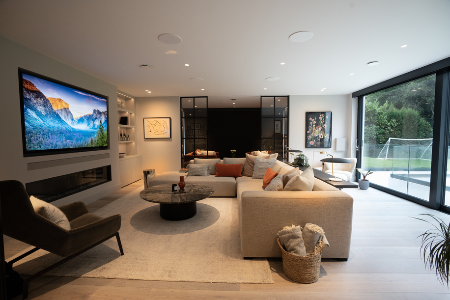 The result is a system where, as part of a whole-home integration project, the owner can transition from everyday living to an entertainment mode effortlessly. The lighting and blinds are synchronised with the audio-visual system, ensuring that all elements work in harmony to create an immersive environment. These features not only enhance the functionality of the room but also contribute to the overall aesthetic, maintaining the elegance and simplicity of the living space while providing advanced technological capabilities.