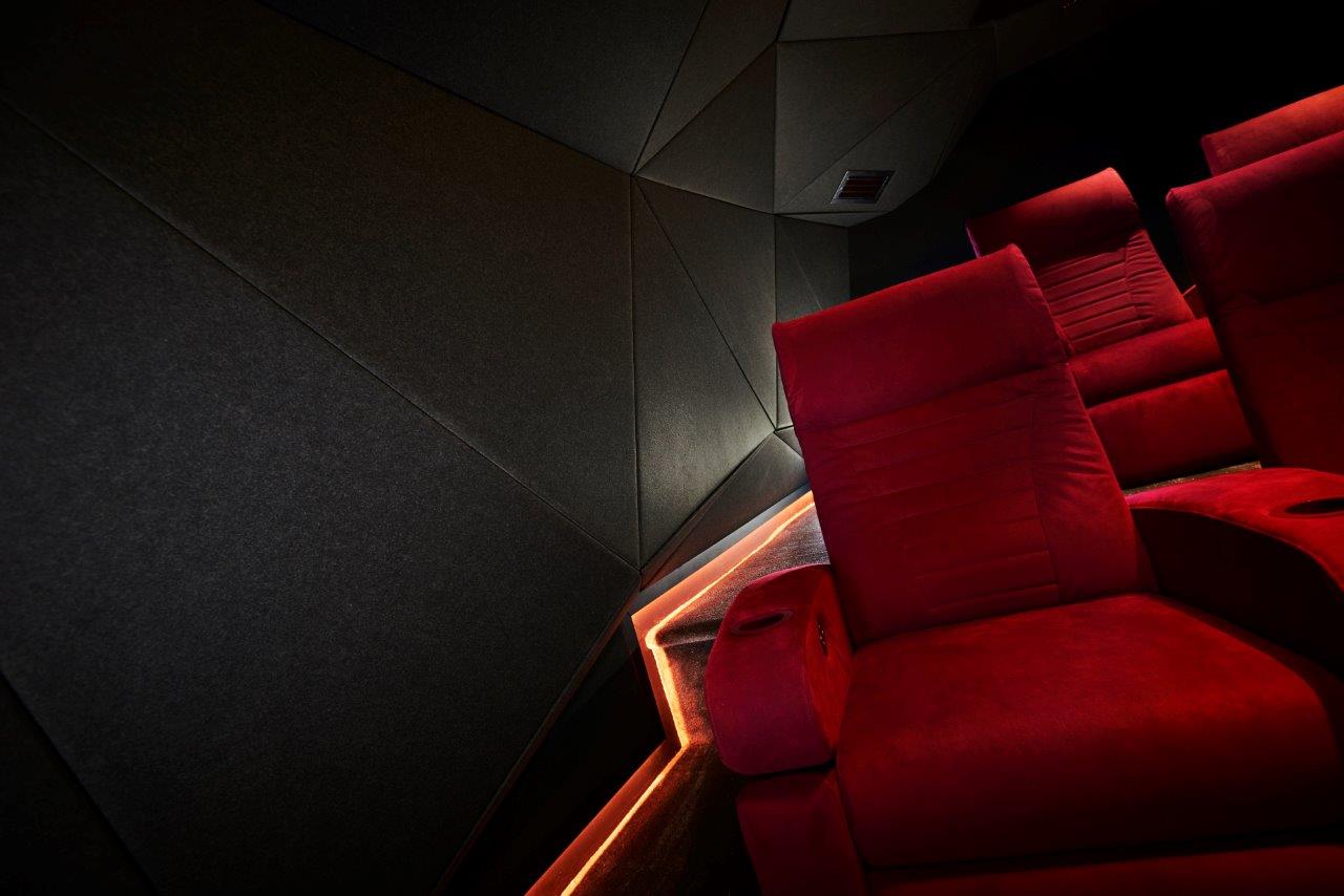 For this cinema, Pyramid designed a concept that ensured as well a controlled acoustic space as possible, incorporating the speakers invisibly, acoustic treatments, bass traps and raised seating platform.