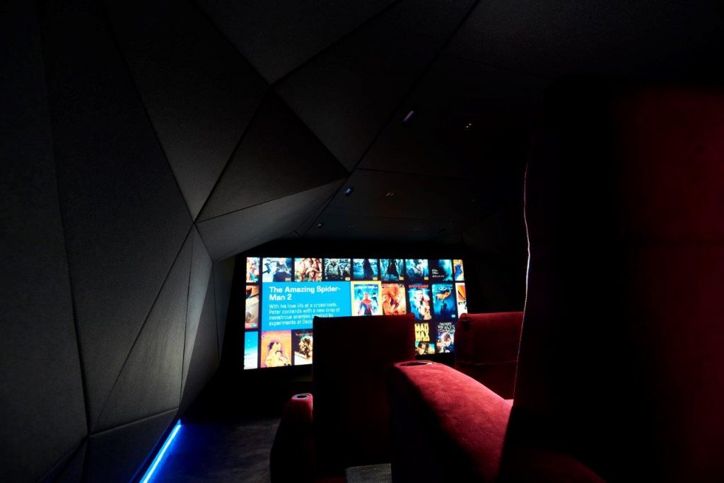 “A traditional trapezoidal enclosure means increased speaker depth and whilst the room was wide enough to accommodate these along the sides, the 2.3m ceiling height proved more of a challenge. Our unique 3D faceted ‘cave like’ design accommodated this level change whilst at the same time creating a unique and exciting environment that is different from the all too often employed home cinema designs in the marketplace today. ”