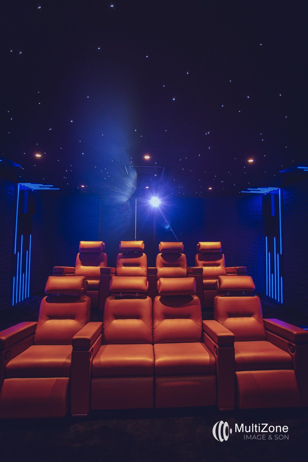 Designed in a mix of contemporary style and inspired by the great French luxury design houses, such as Hermès, Multizone’s Antonia Davin transformed the unused room. The private home cinema invites up to eight guests to relax in the Oray adjustable recliners upholstered in a buttery tan leather reminiscent of the iconic French brand. The walls are covered in royal blue sound-absorption panels and accented with modern lighting features and a star ceiling that bathes the room in a soft glow. For video, Antonia installed a JVC DLA-N5 UHD 4K projector with a Lumene projection screen; an Apple TV and Sony UBP-X800M2 UHD 4K Blu-ray player as the video sources. The room’s audio includes Elipson Infinite Series speaker system and an ARCAM AVR20 receiver.