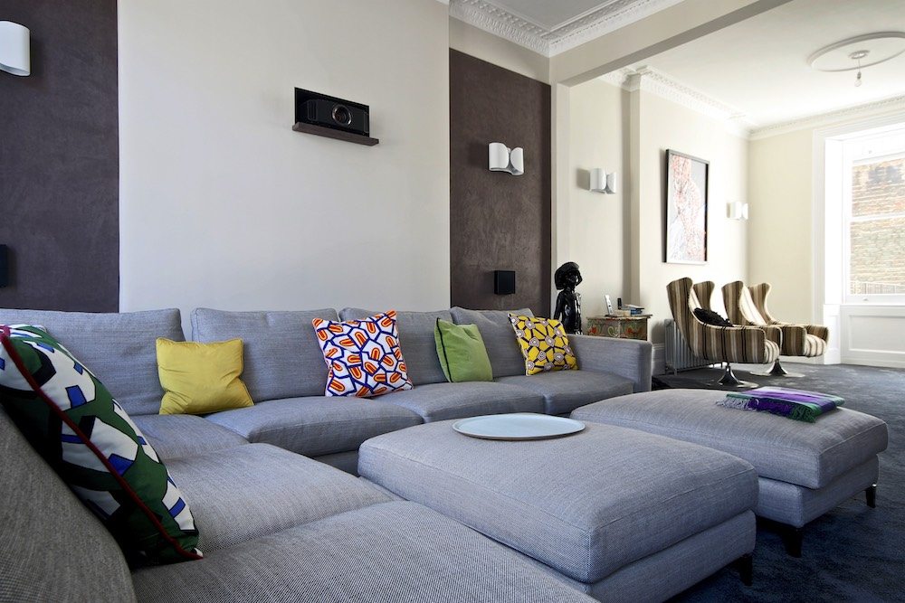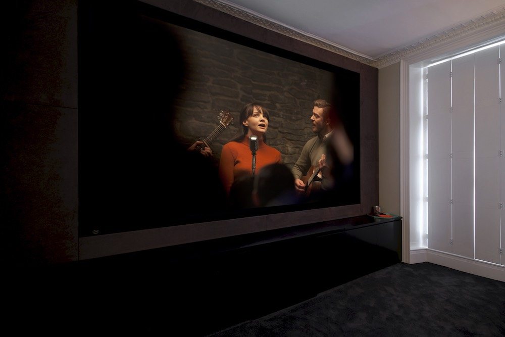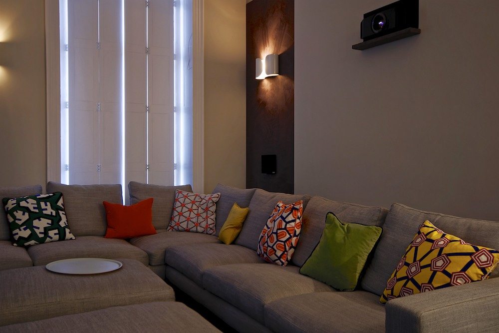 Given this pad was in the middle of the UK’s busiest city, space is typically at a premium – thankfully, that wasn’t exactly the case with this property. With the room’s high ceilings presenting a challenge to the team, while the client wanted the largest screen possible.