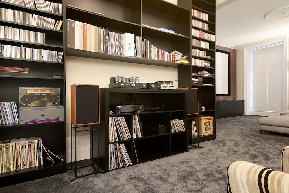 The remaining part of the room was designed with bespoke joinery to house the client’s personal music collection and HiFi, creating a dedicated space for the clients to sit and listen to their extensive record collection.