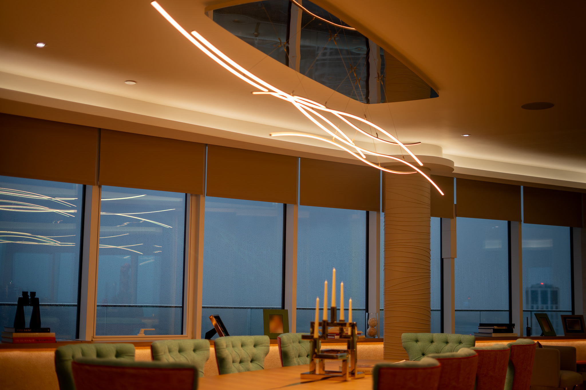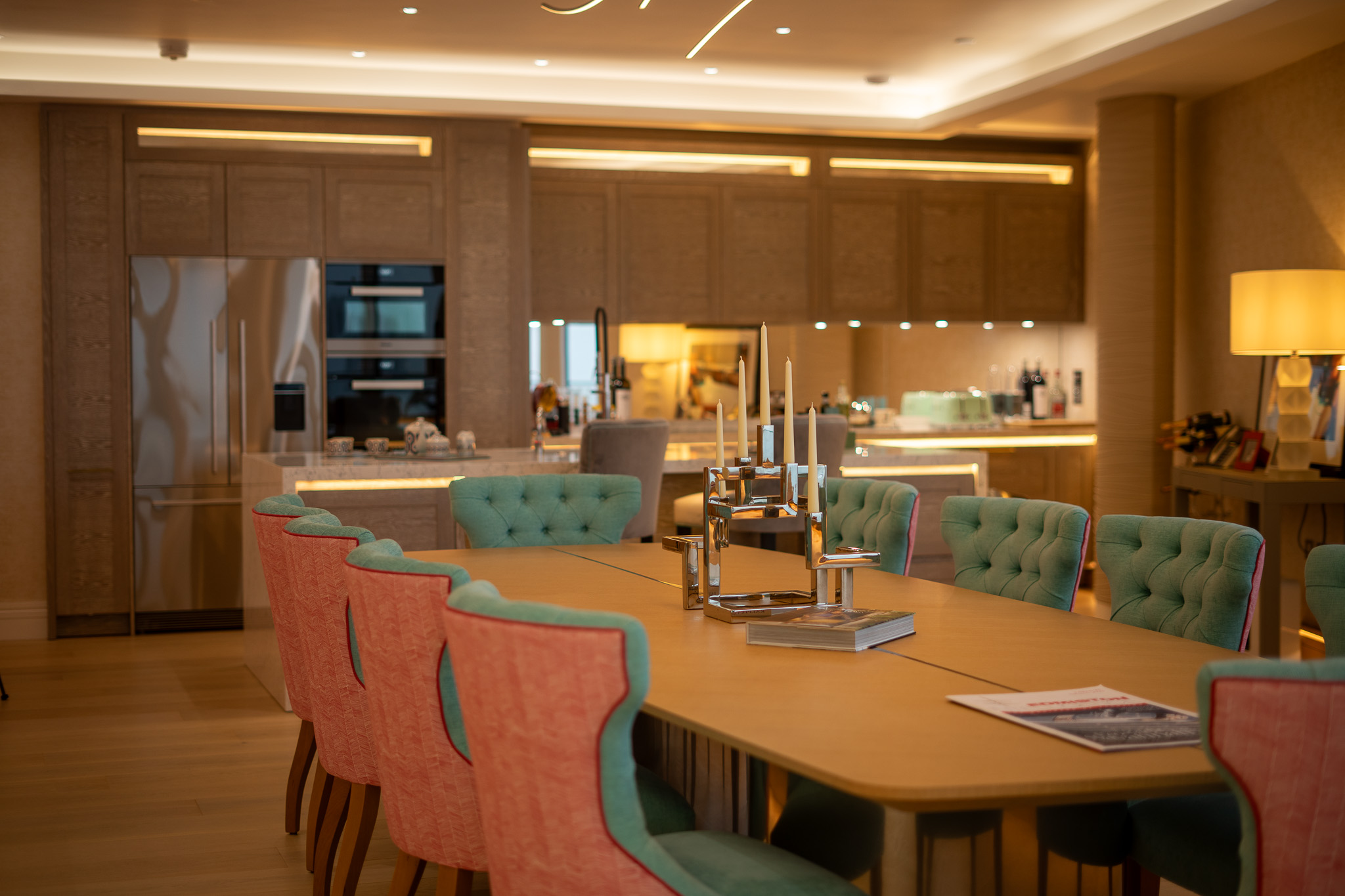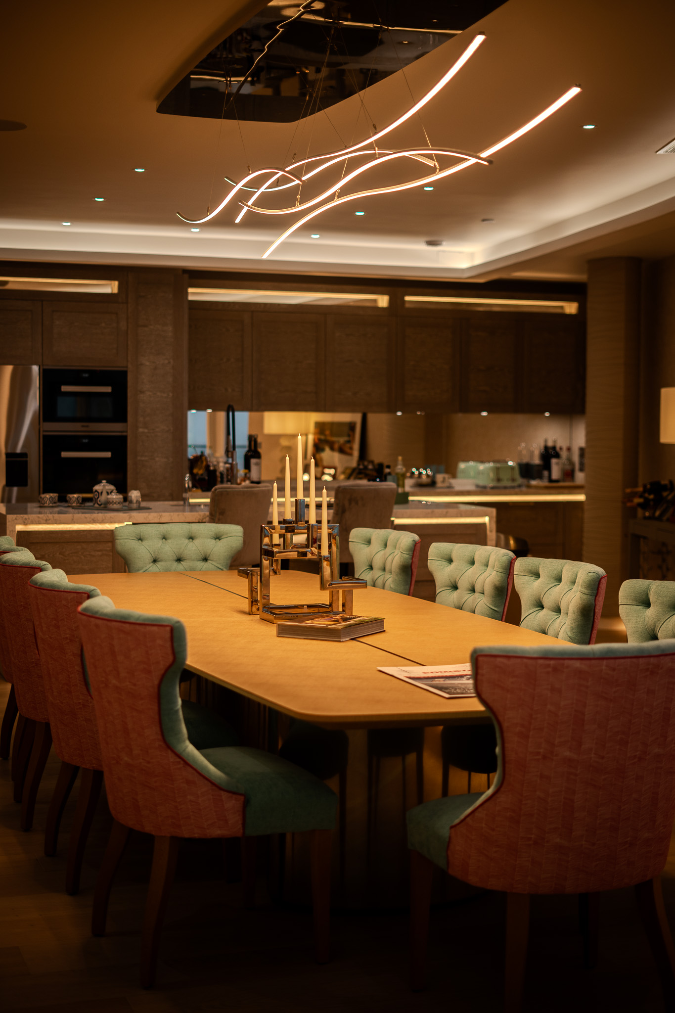 The lighting design also incorporates coffer lighting, table lamps, downlights and a number of picture lights highlighting original artwork, with a striking bespoke pendant fitting spanning more than two metres over the dining table.