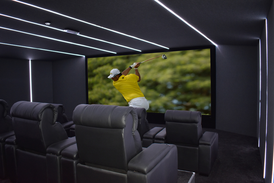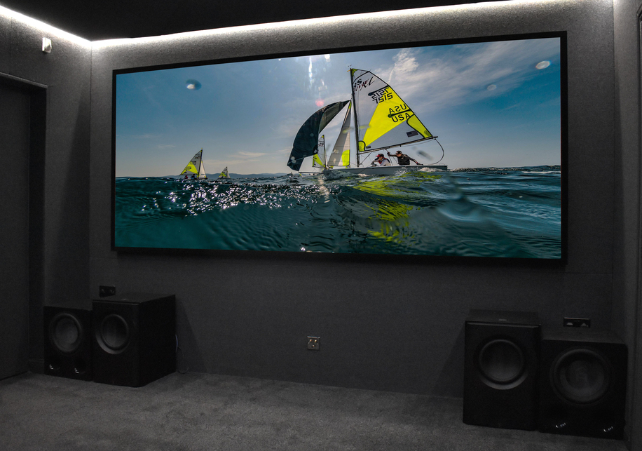 For video the smaller space features a 75in TV and the two larger spaces, JVC projectors: DLA NZ5, DLA-NZ9BE respectively. Each room is fitted with Cinema Build Systems fabric tracking in three different styles. The screens in the mid and main room are both Cinema Build Systems 2.35:1 acoustically transparent 3m and 5m designs, and all systems are wired with In-akustik cables, designed and manufactured in Germany.