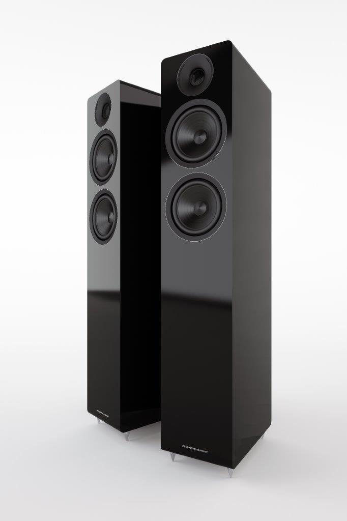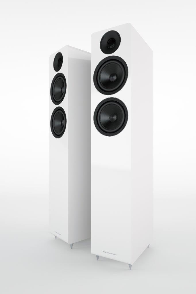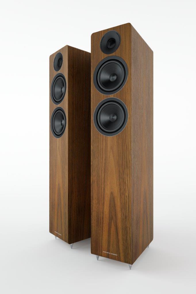 The AE308 is in real wood walnut veneer, piano gloss black or white lacquer to match the other 300 Series models and has sturdy carpet-piercing spikes which come with rubber caps for use on hard flooring.
