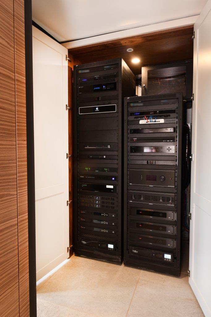 Dedicated air conditioning unit in the plant room with temperature probes inside the racks are also included automatically maintaining a maximum temperature of 24° in the racks. The AC unit is connected to Wi-Fi and so can generate Savant Pro notifications if rack temperature exceeds the limits.