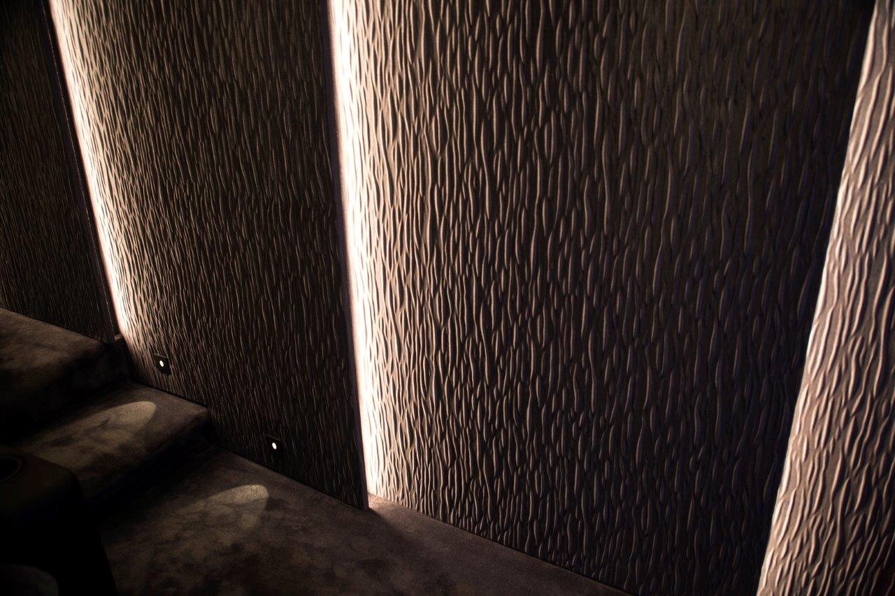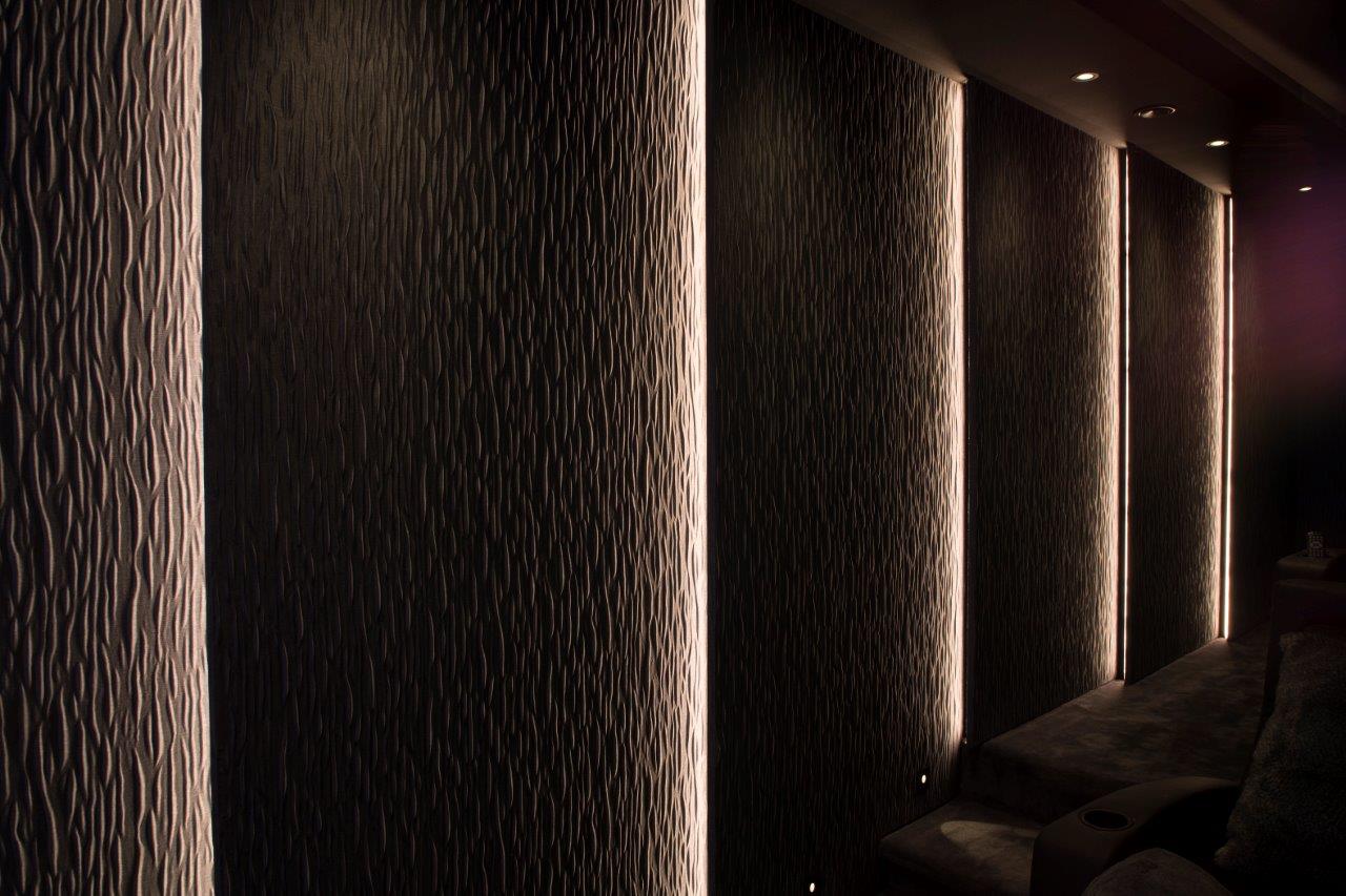 A ‘shark fin’ design was created to give the room aesthetic appeal, with LED strip lighting integrated into the ‘fins’. These LEDs dim automatically whenever video content is playing, leaving just the floor lights dimly illuminated (unless in daytime viewing mode).