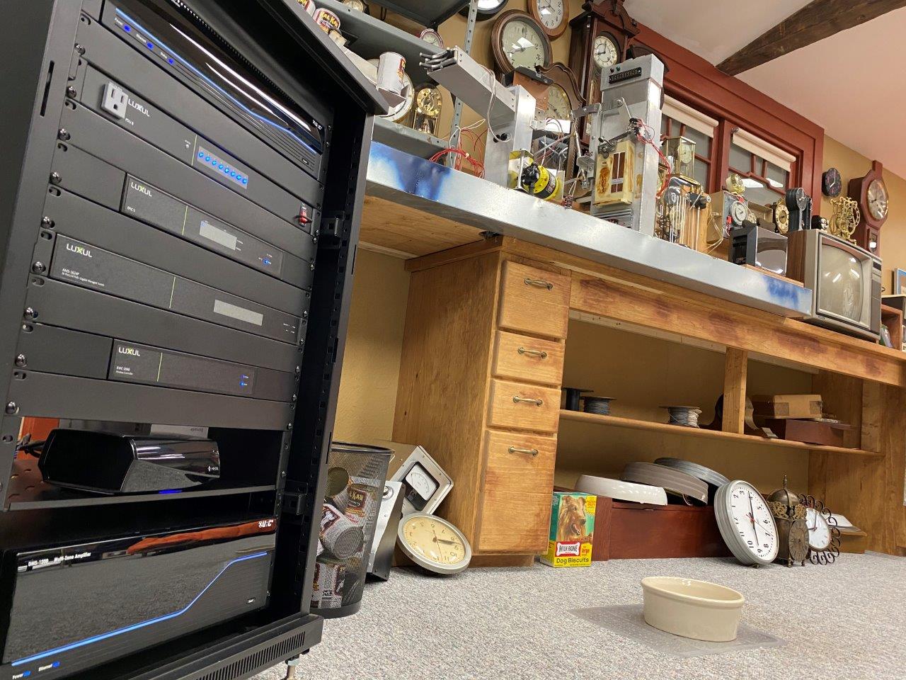 The installation recreates the opening scene from Back to the Future, for a mind-blowing fan experience – Doc’s radio turns on, his coffee pot starts brewing, the television turns on, toast is browned and dog food is dispensed. The automation of this sequence is triggered by sensors and custom programming from Wavelength and URC.