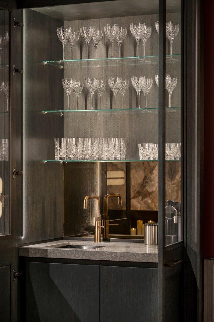 Residential apartments above also have Crestron, so the transition from the living space upstairs through to the entertainment space feels seamless and a genuine extension of the apartments. This is a well-appointed space and has a slightly James Bond/Kingsman feel to it, which is only enhanced when paintings on the walls rise using Future Automation lifts to reveal amongst other things a drinks cabinet. The action of the lifts combines well with some subtle lighting that really takes this feature to where it needs to be, it feels completely right for the space adding some fun and drama. The AV performance in this space is also impressive, offering a mixture of music only and media room viewing options.