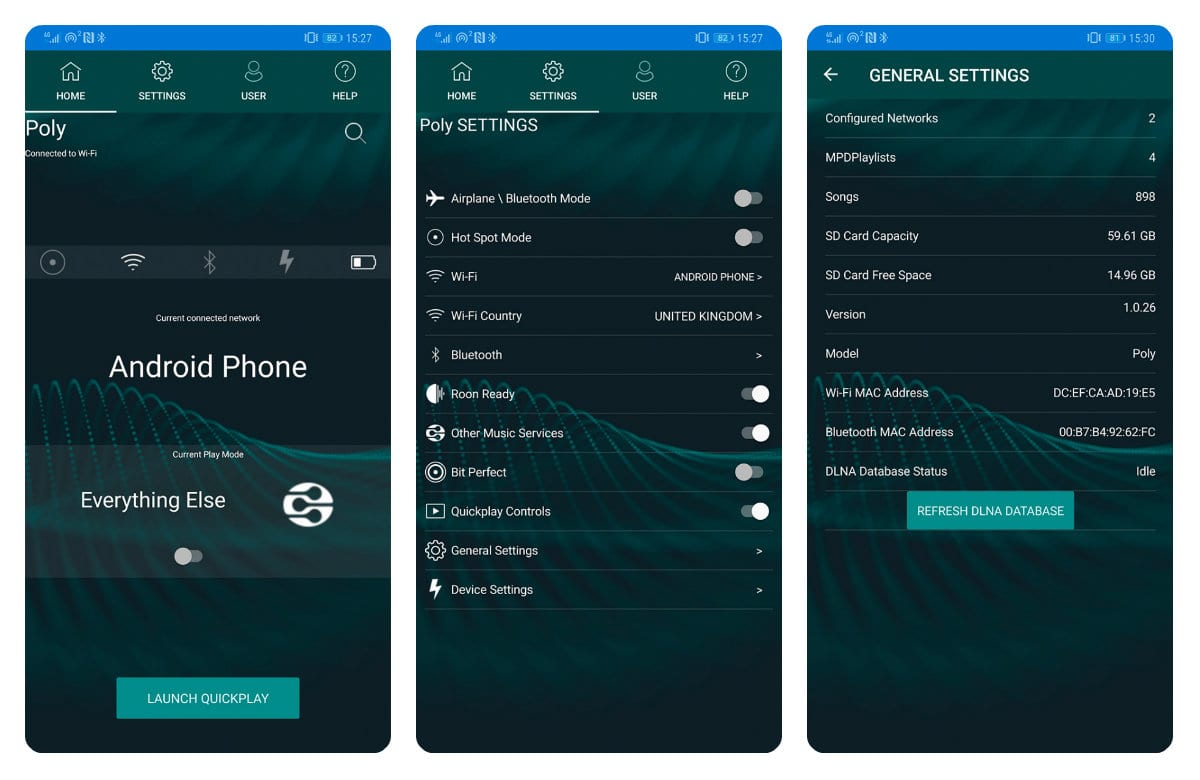 Settings also enable simple Roon operation when using Poly as an endpoint. Slider switches offer easy on/off toggling for Roon-ready and Roon DSD modes. Easy switching for alternative play modes and QuickPlay control activation is also available from the main settings screen.