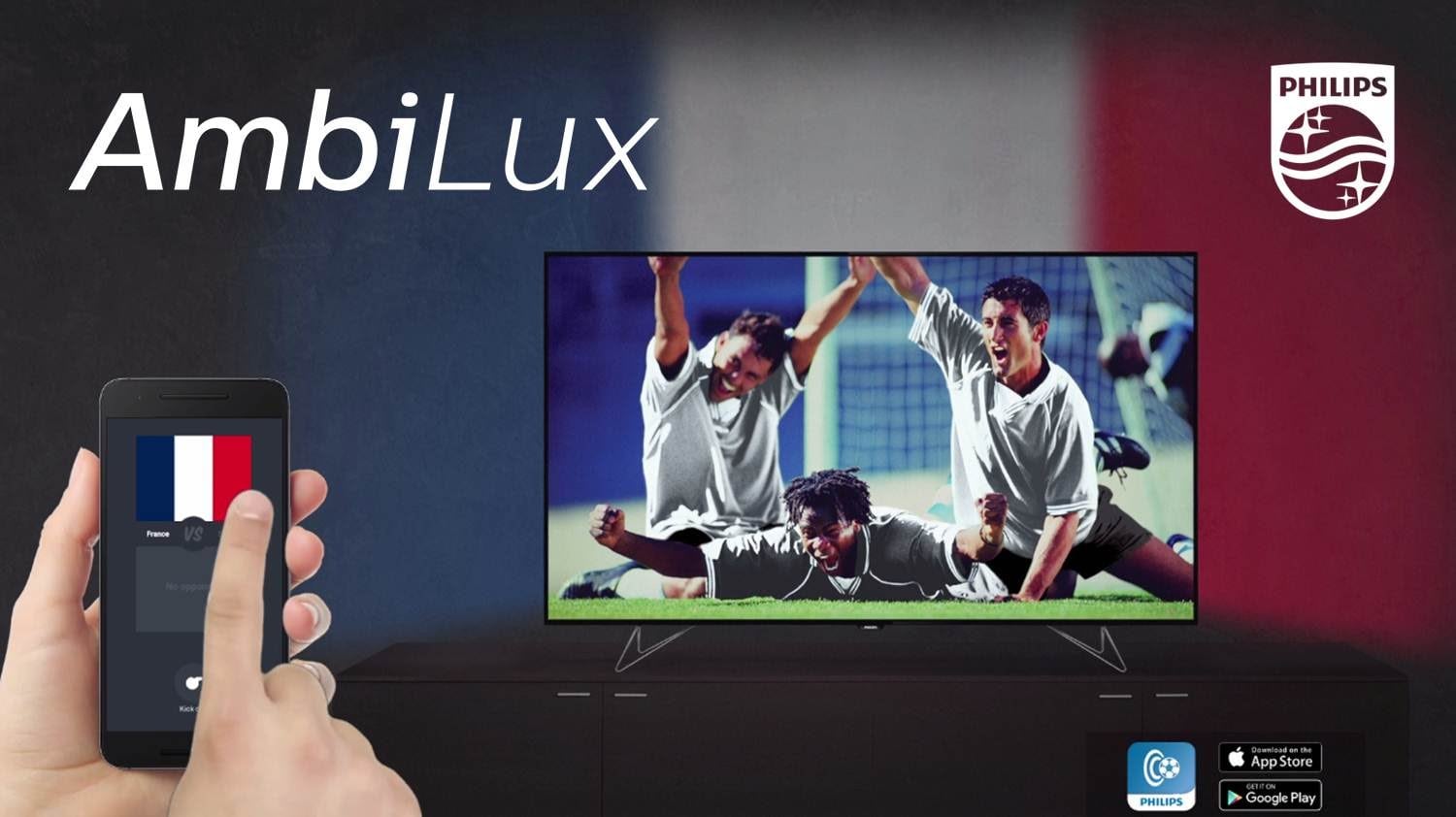 Even the cheers of the football party can be detected – via the activated mic in the user’s phone or a tablet – and used to intensify the Ambilight light show, encouraging fans to cheer their team to victory.