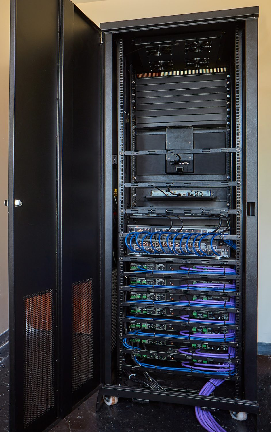 A store room to the side of the theatre was incorporated into the design and converted into a standalone rack room. “The rack dressing for the project was designed per industry standards and proved to be a value-added service to the client, as having a dedicated rack in a country with intense heat and dust problems is particularly helpful,” notes Ankur.