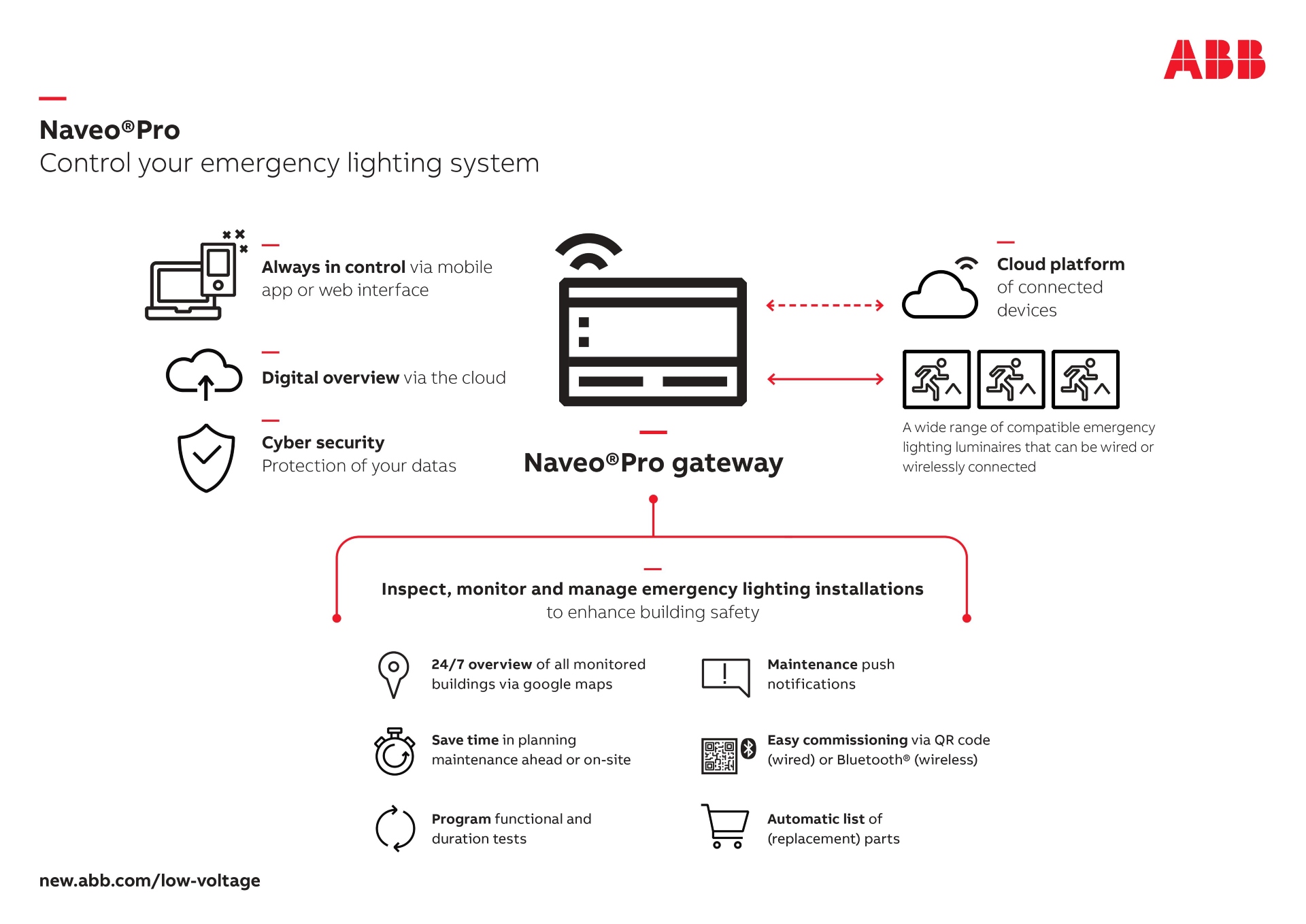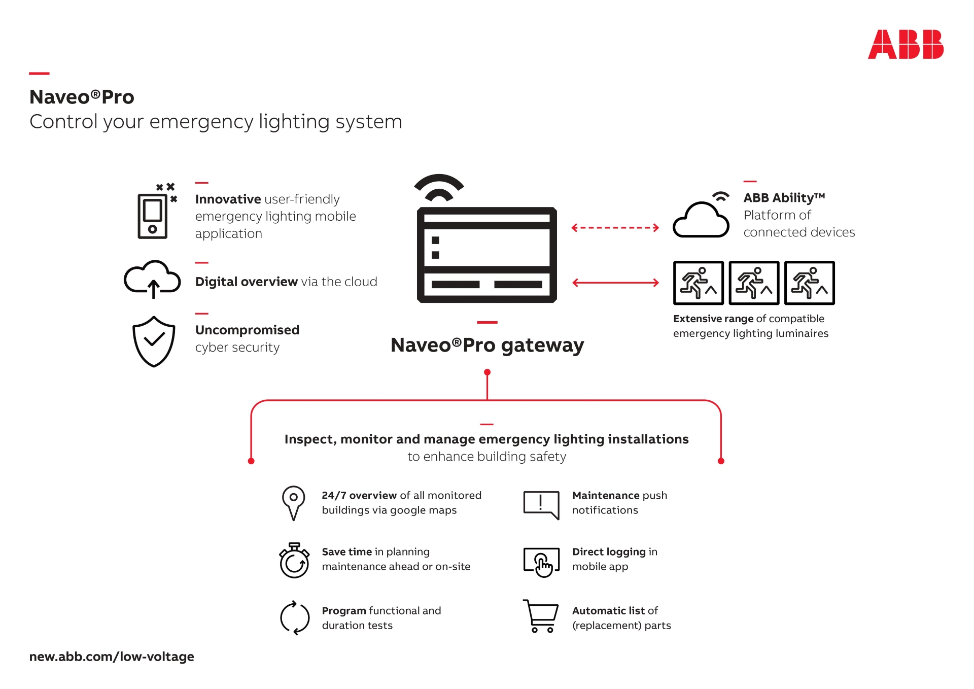ABB has introduced Naveo Pro, a transparent and proactive way to allow building owner and facility managers to install, monitor and maintain emergency lighting systems with the ease of a mobile device. The system offers various functionalities to reduce time and costs on inspection and maintenance.