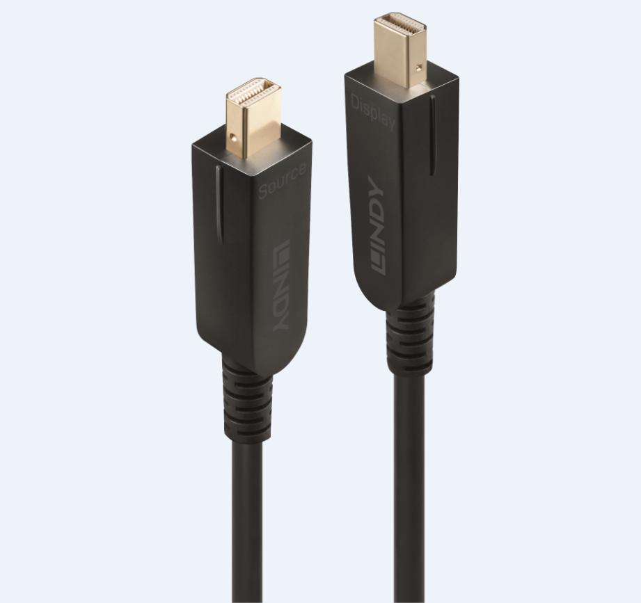 Lindy’s range of Fibre Optic Hybrid (copper and fibre optic) Mini DP 1.4 cables with detachable connectors are the professional solution for extending both Mini DisplayPort and DisplayPort signals over longer distances, with no requirement for additional adapters. Combining the flexibility and high EMI and RFI resistance of fibre optic cable with standard copper cabling, these hybrid cables are ideal for use in critical AV setups or commercial installations.