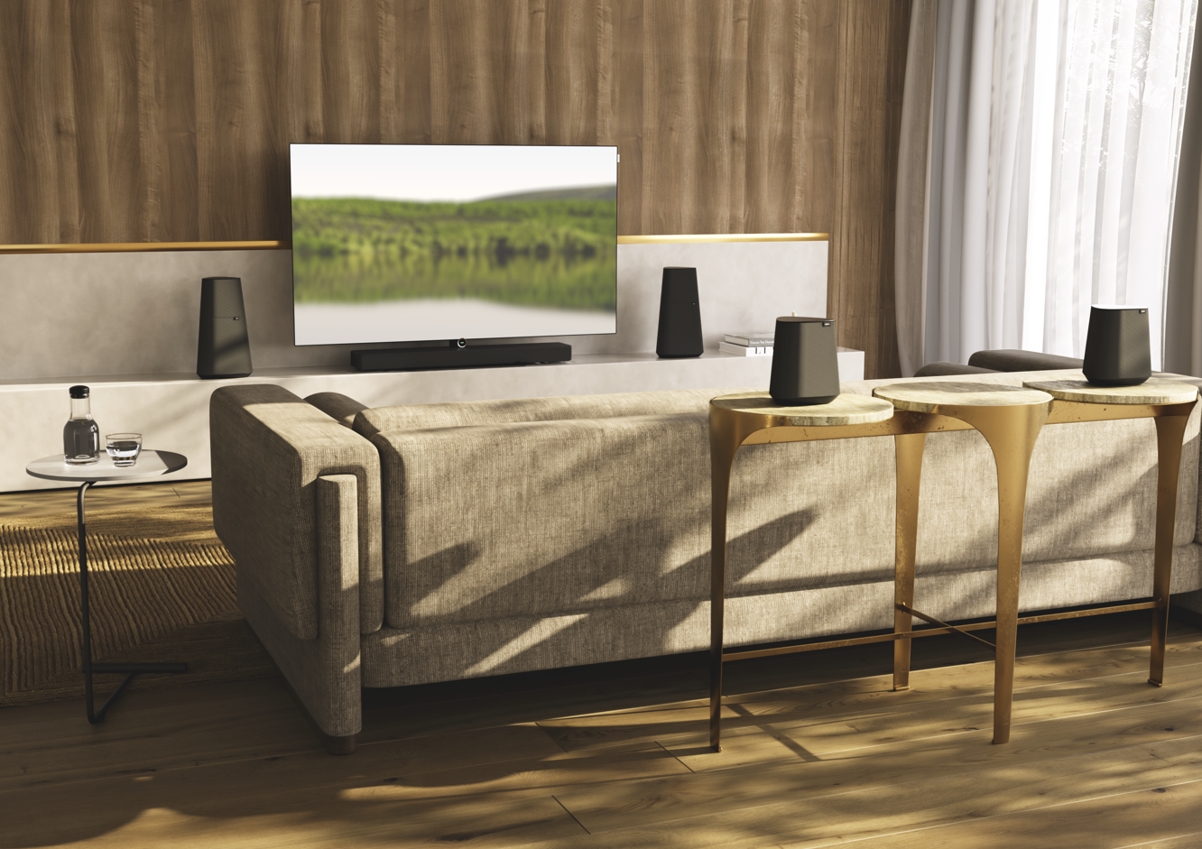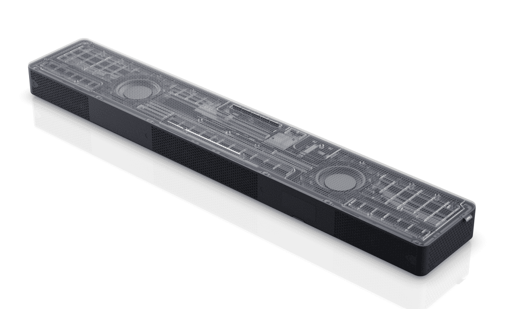 Unique to the klang bar3 mr, the soundbar is compatible with active wired speakers. An integrated 5.1 AV receiver with classic cinch sockets ensures connectivity with speakers from other manufacturers to deliver an immersive home cinema sound experience with almost any existing speaker. A discrete 5.1 system can be created wirelessly with speakers from the Loewe klang mr series through Loewe’s own latency-free Wireless Digital Audio Link (WDAL 2.0) technology.