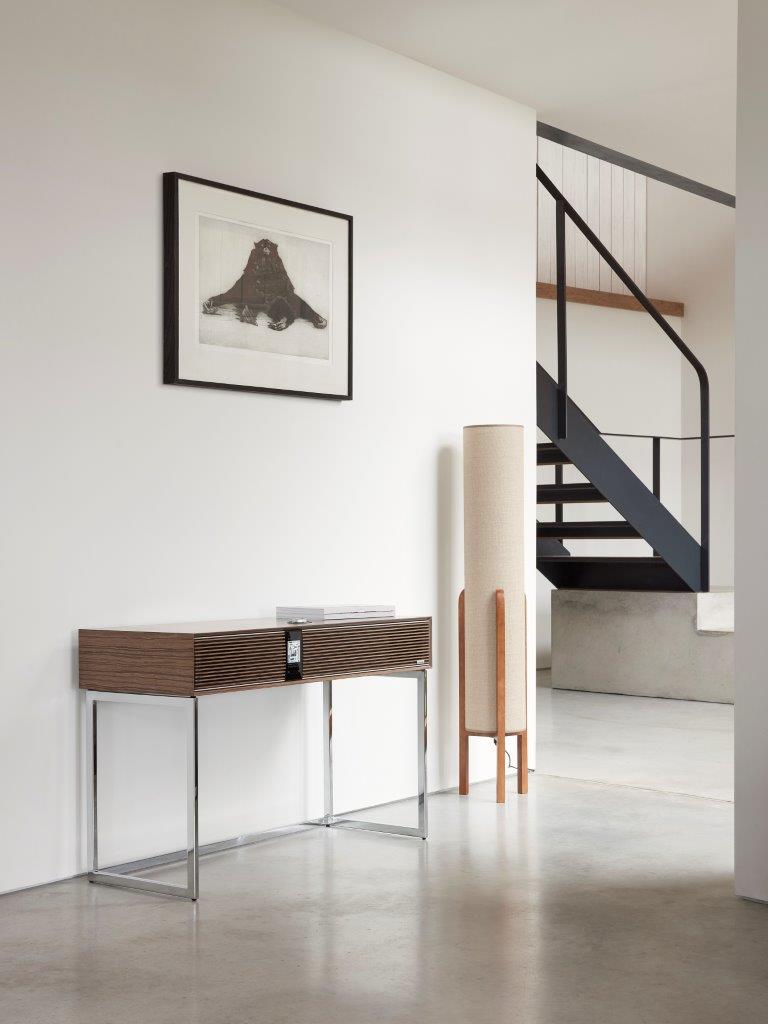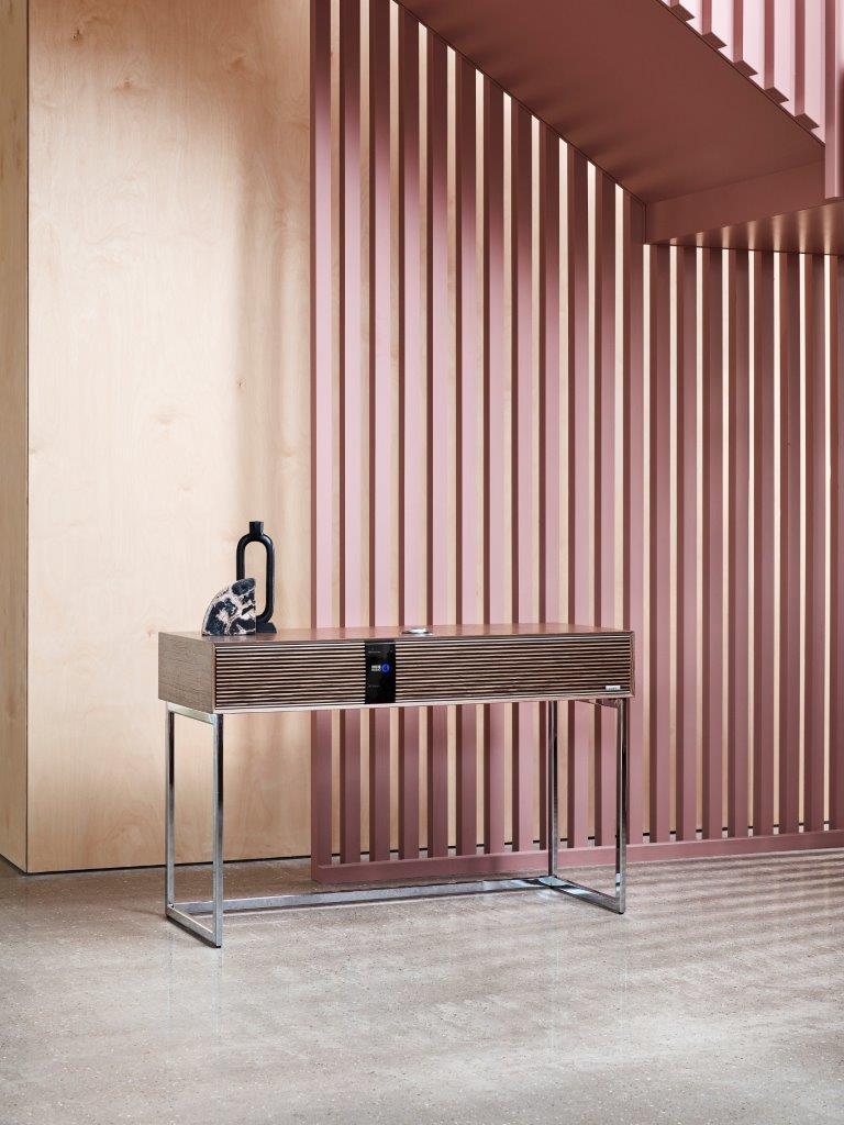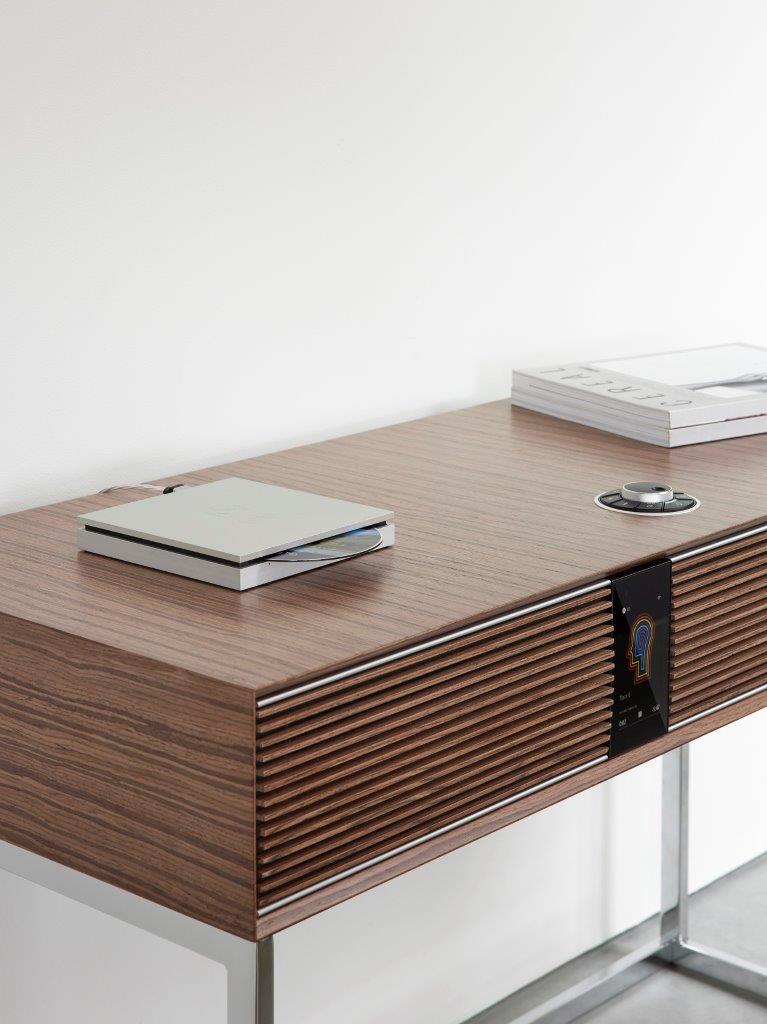 With precision formed trims and a polished chrome stand, R810 radiates sophisticated style, says its creator. Effortlessly versatile, R810’s veneered cabinet makes it a refined piece of home décor.