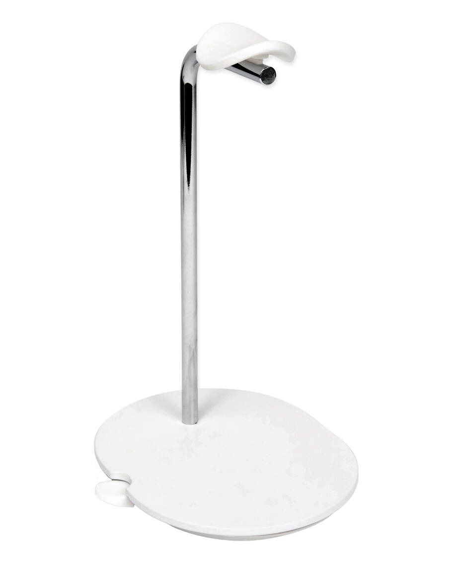 Available in black and soft white, to match the headphones, the stand’s aesthetic takes its styling clues from the ‘phones. The use of soft silicon for the cradle, that comfortably seats the headband of the Ace, ensures the lasting integrity of the soft headband, says Sanus. The solid, powder-coated, steel base prevents accidental tipping and incorporates a cable management system to keep the cable tidy, plus a handy magnetic clip for the charging connector.