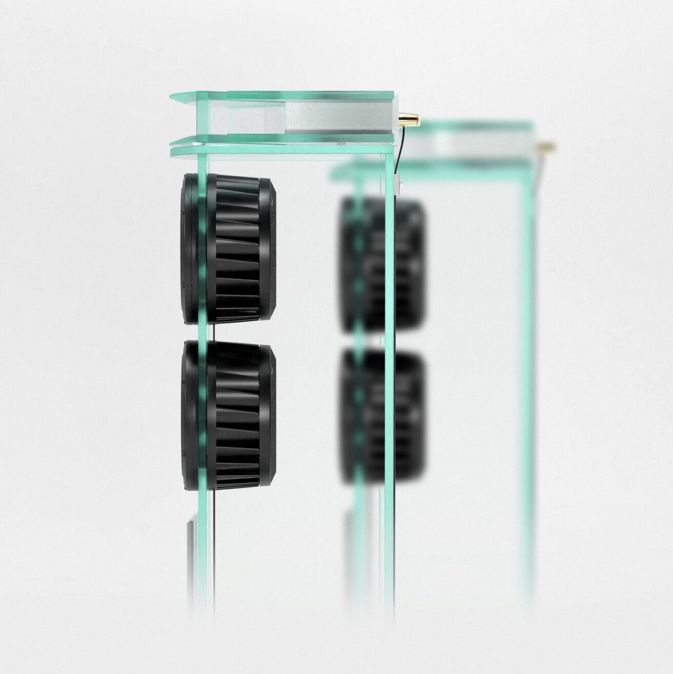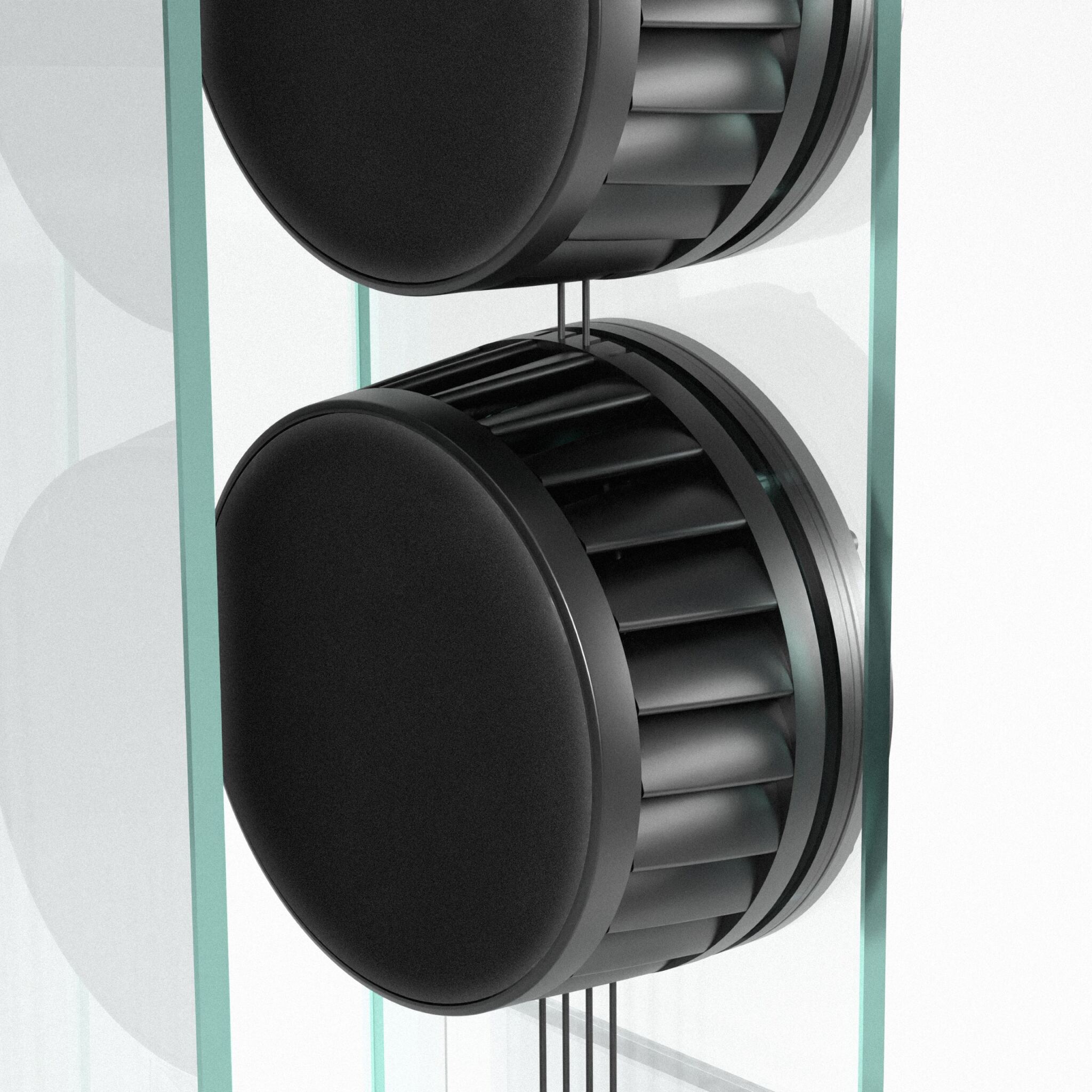 Waterfall’s proprietary JETSTREAM damping technology, inspired by jet engine design, delivers acoustic clarity by controlling rear wave reflections and damping mid and high frequencies. Its advanced aluminum turbine structure also preserves airflow for optimal bass, enhances heat dissipation and ensures mechanical decoupling of the drivers from the glass enclosure.
