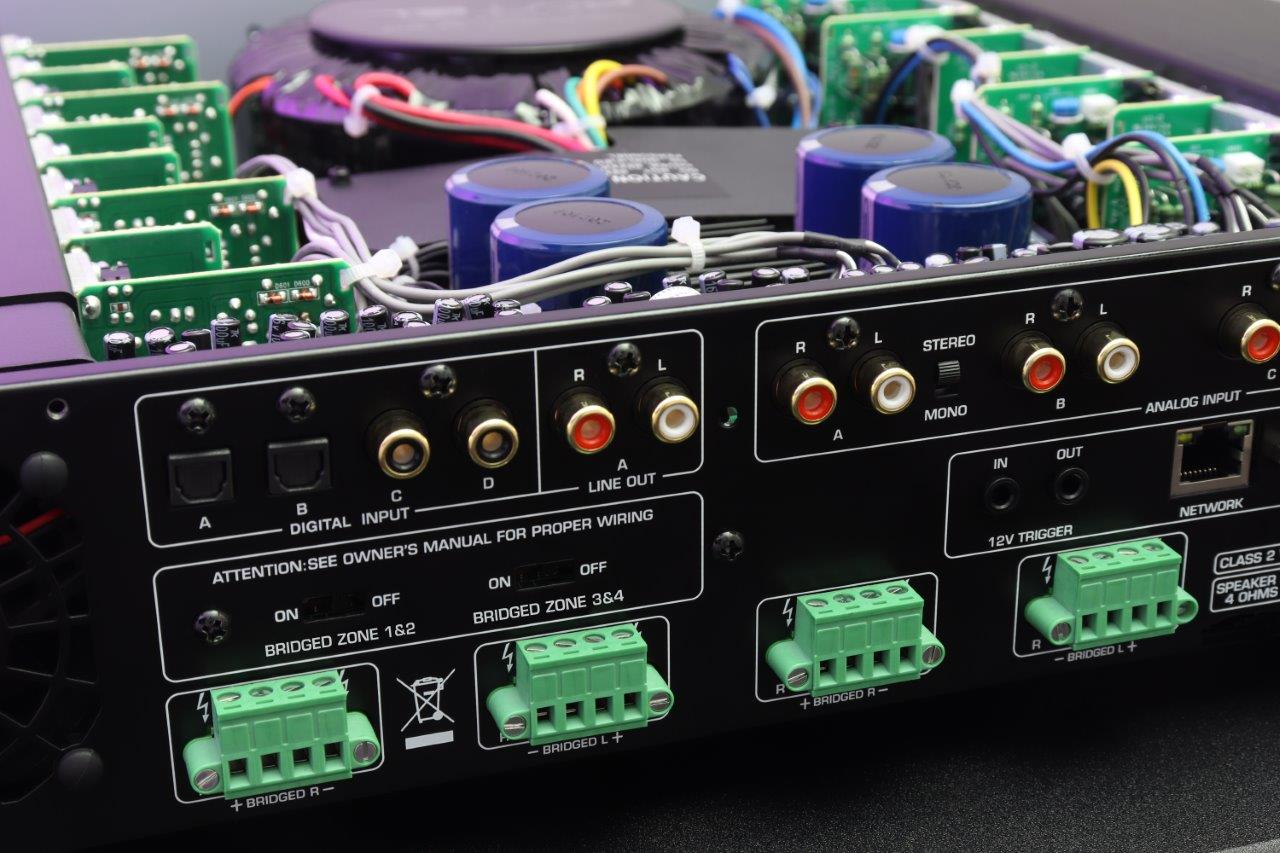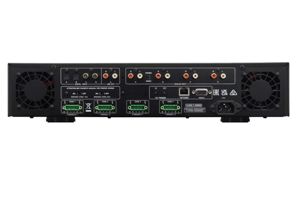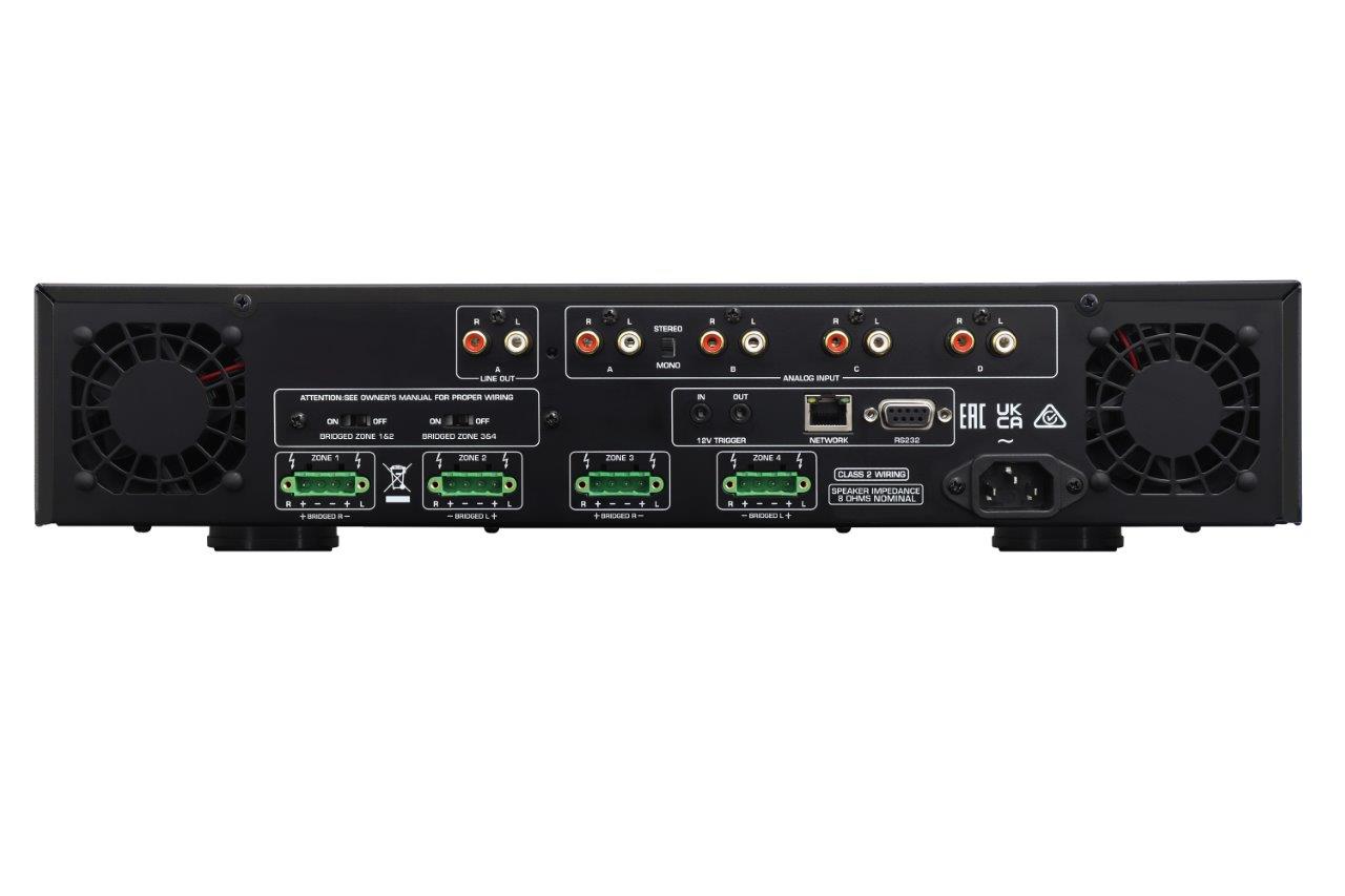 The front panel of each amplifier features a graphic display with controls to ensure user-friendly setup and operation, including selection of the active matrixed input source and volume control of each zone in real time. The custom engineered 2U height chassis does not require top or bottom clearance spacing for ultra-efficient rack mounting with the included rack ears. Speaker outputs utilise detachable Phoenix connectors for pre-wire installation with worry-free, secure screw-locking mechanisms. Ethernet, RS232 and 12V trigger connections provide easy integration with popular control systems, emphasising the customisation available to incorporate these units into virtually any system.