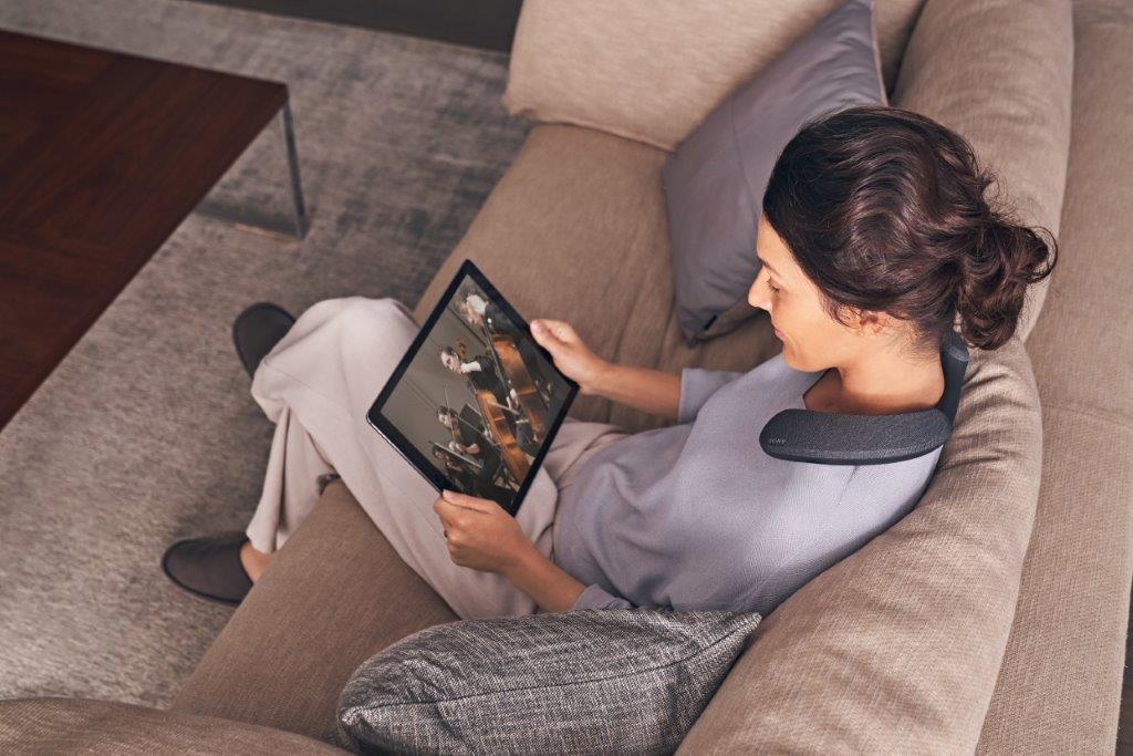 The SRS-NS7 is said to provide hours of comfortable viewing thanks to its flexible and ergonomic design that fits securely around the neck. The flexible band on the back of the speaker helps find the perfect fit.